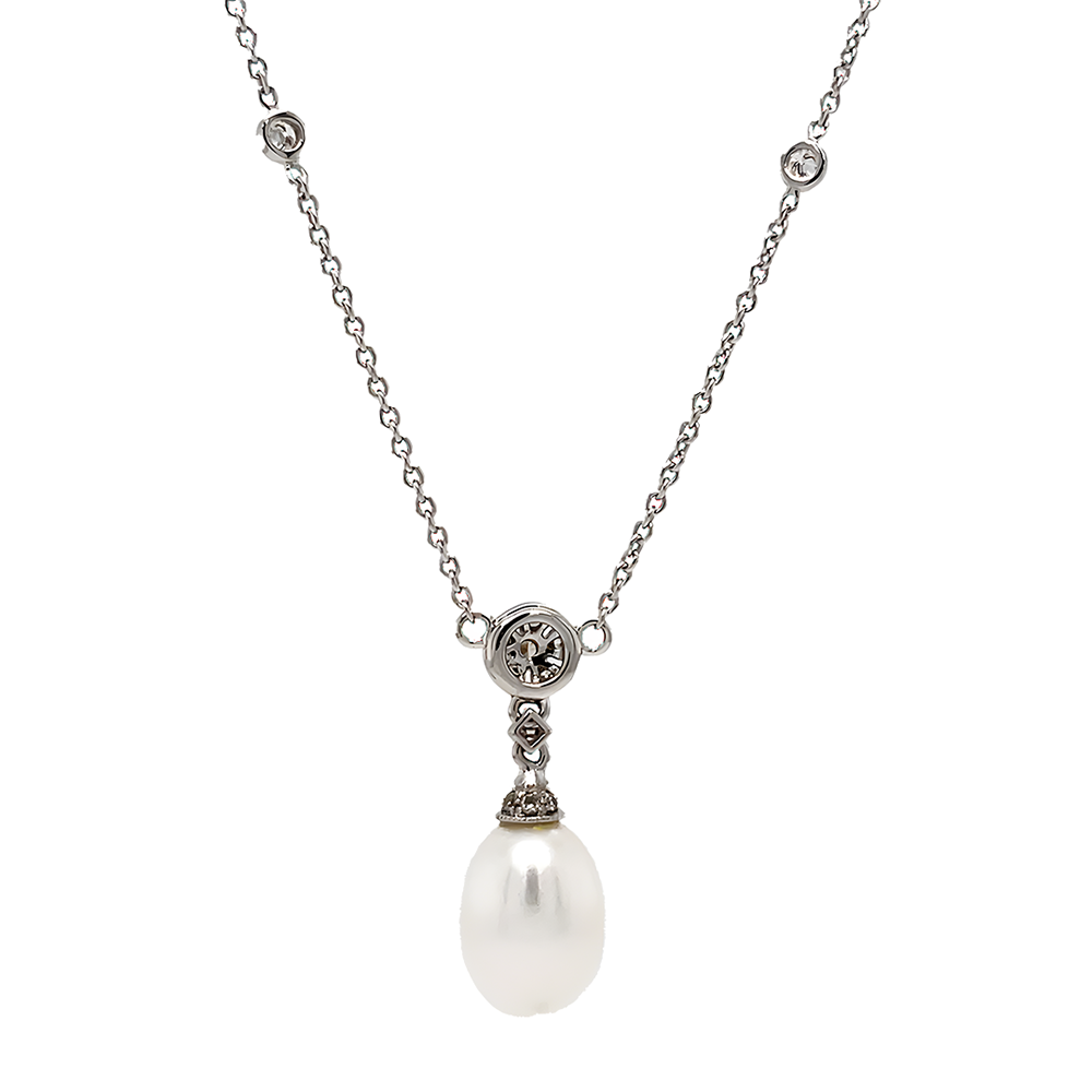 The pendant features a pear-shaped freshwater cultured pearl suspended by a diamond-set surmount to a fine diamond spectacle-set adjustable trace chain.
