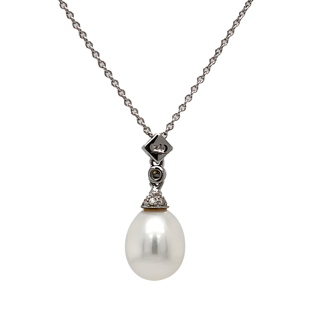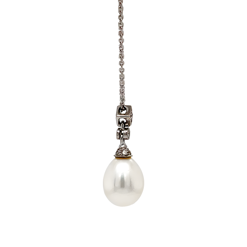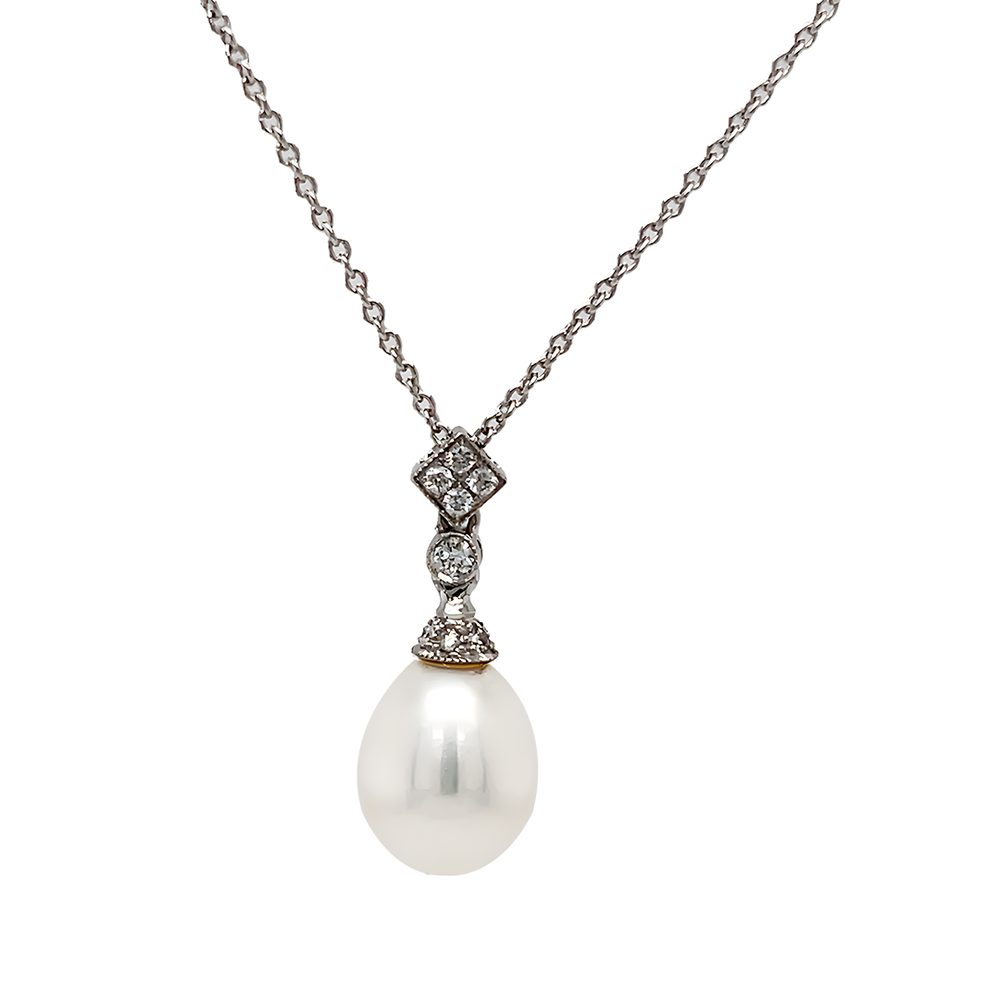 The pendant featuring a pear-shaped freshwater cultured pearl suspended by a diamond-set surmount to a fine adjustable trace chain.