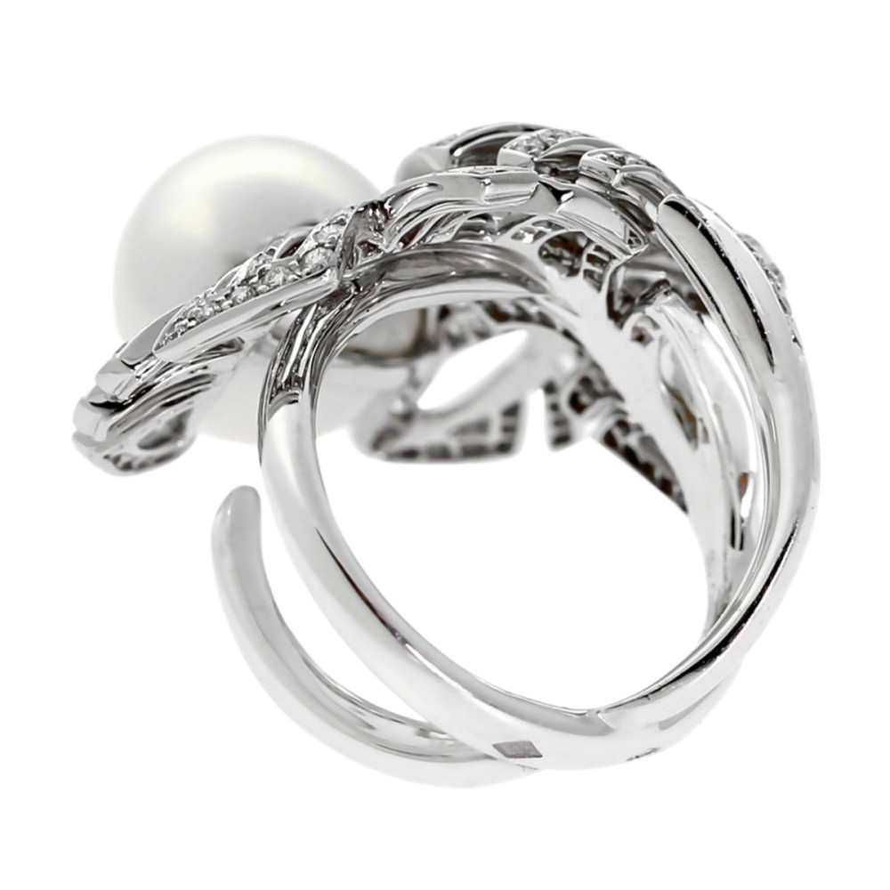 Centering a round cultured pearl, surrounded by 2 bypassing leaves, set with round diamonds.