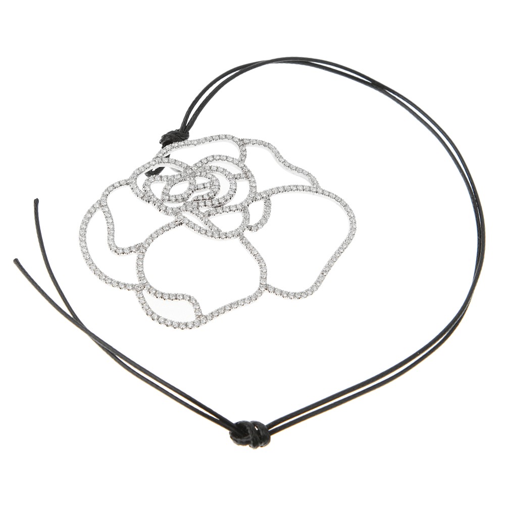 Composed of round brilliant-cut diamonds set in a white gold openwork flower pendant suspended from a leather cord.