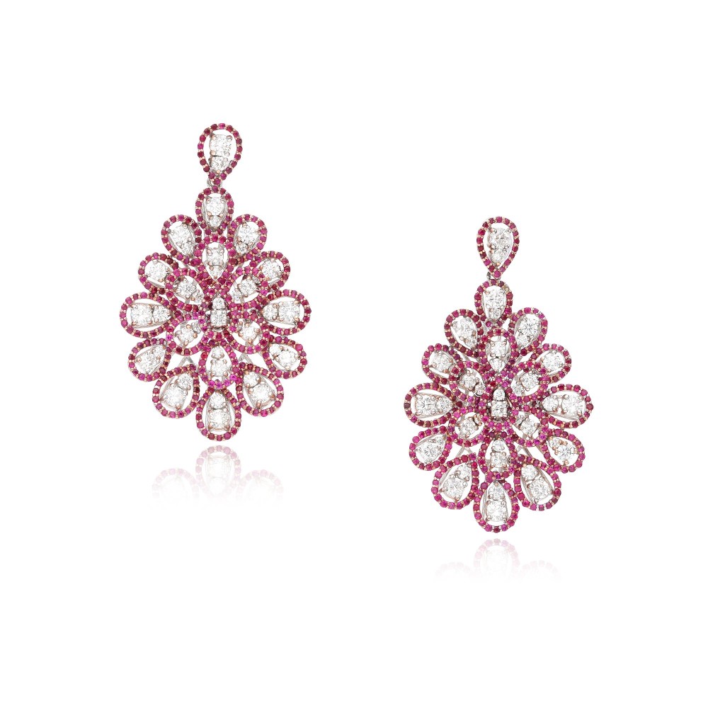 Composed of round-cut rubies and round brilliant-cut diamonds.