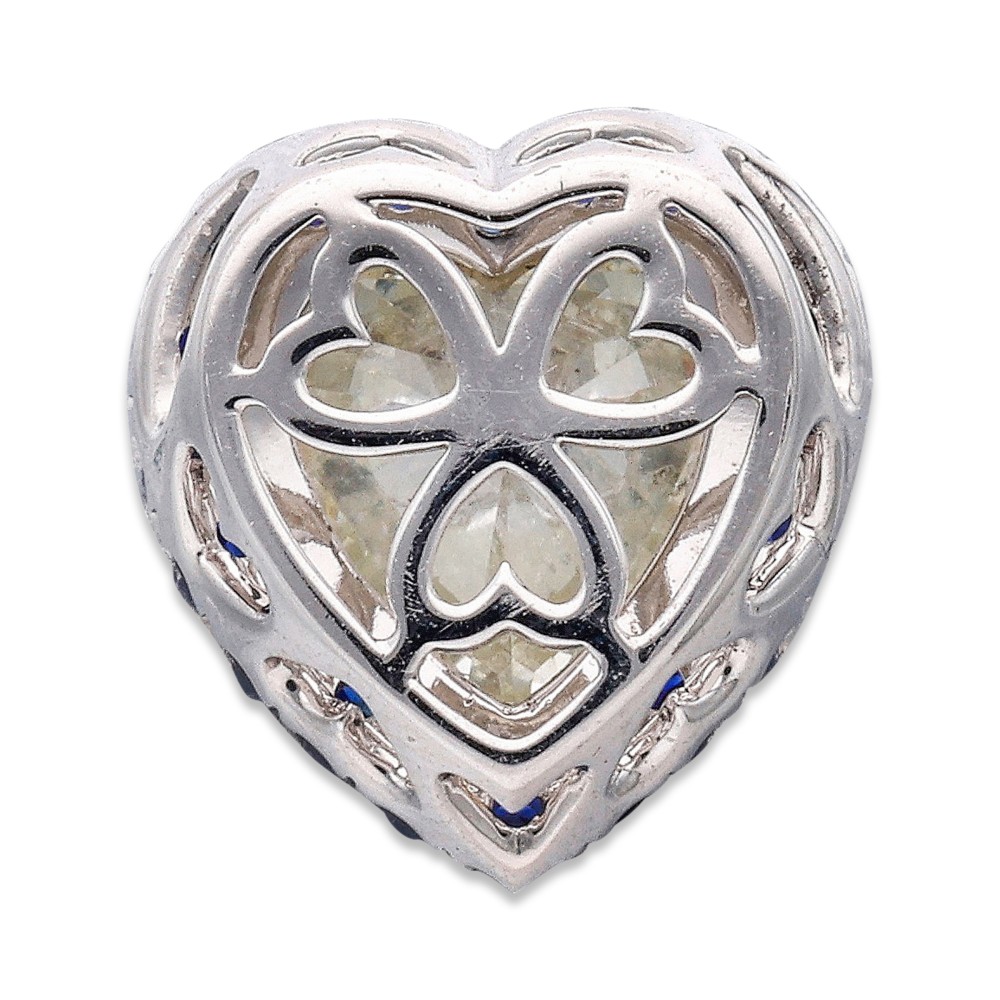 Centering a heart-shaped diamond, accented by round sapphires.