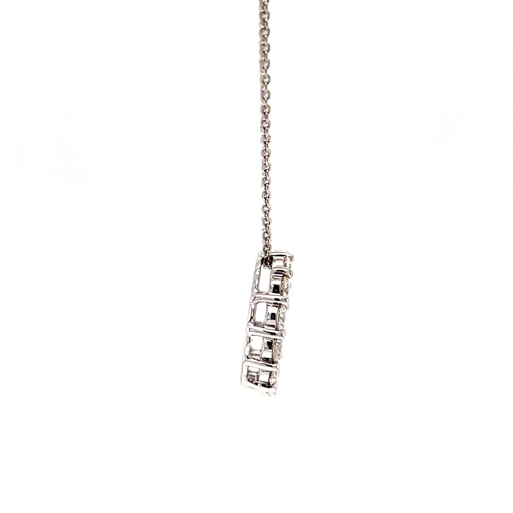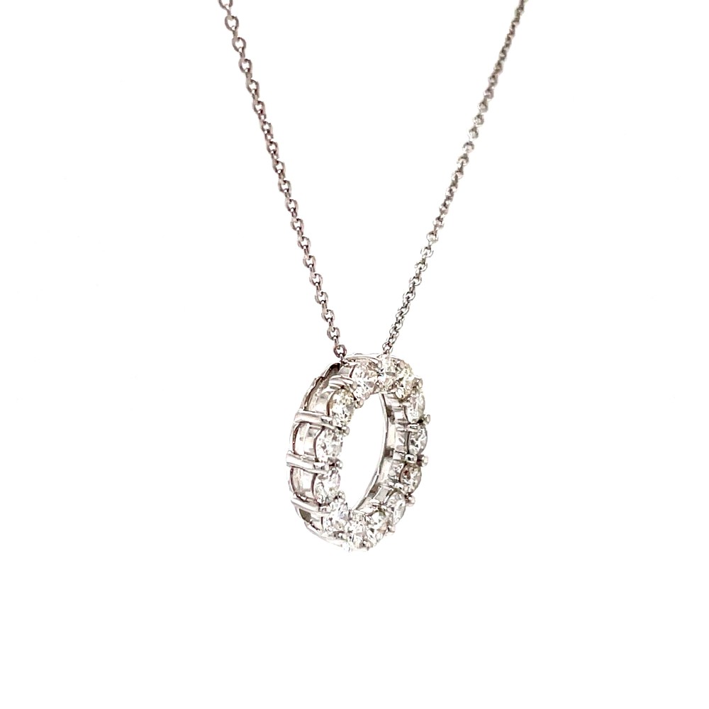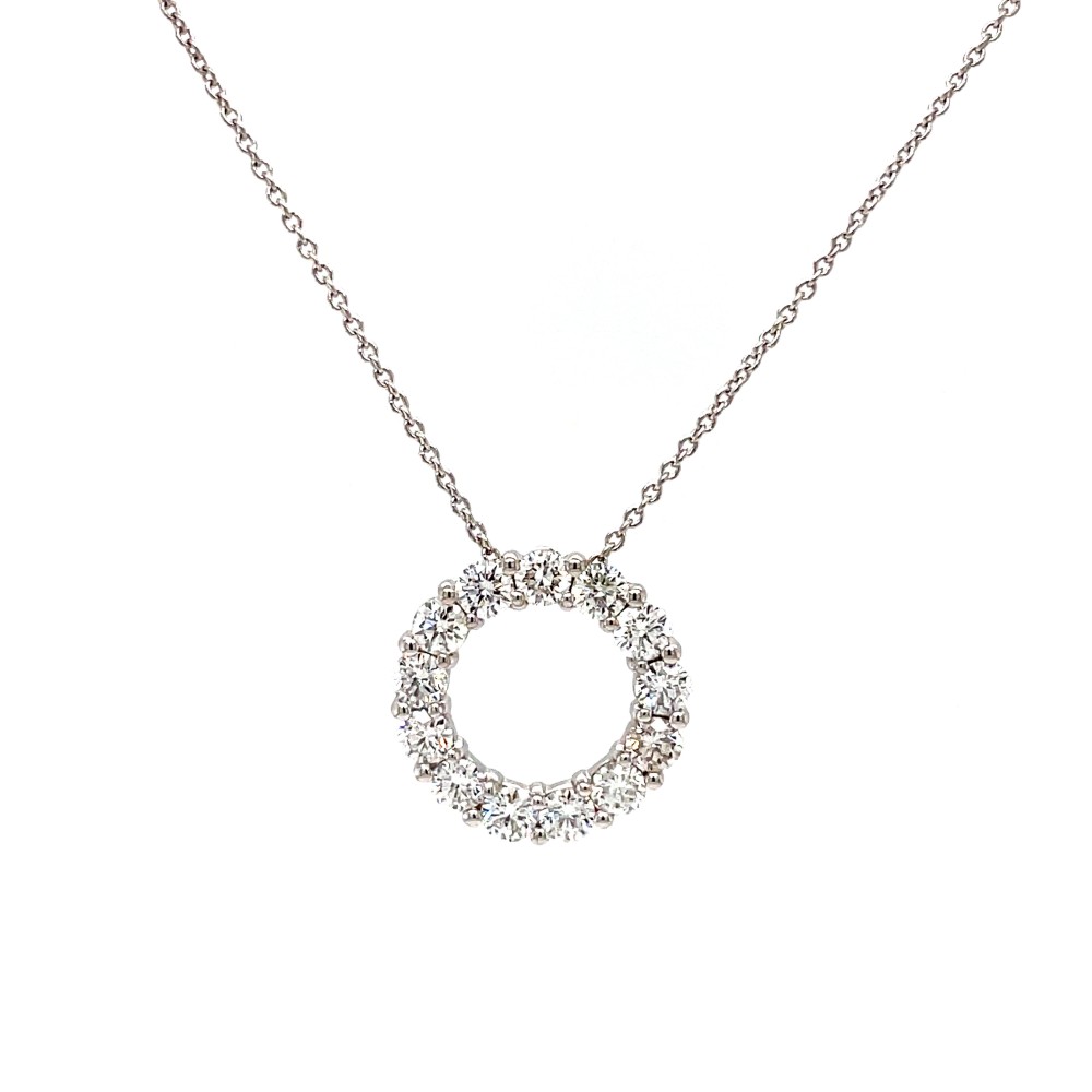 The pendant comprising a circular openwork motif set with round diamonds to an adjustable fine trace chain.