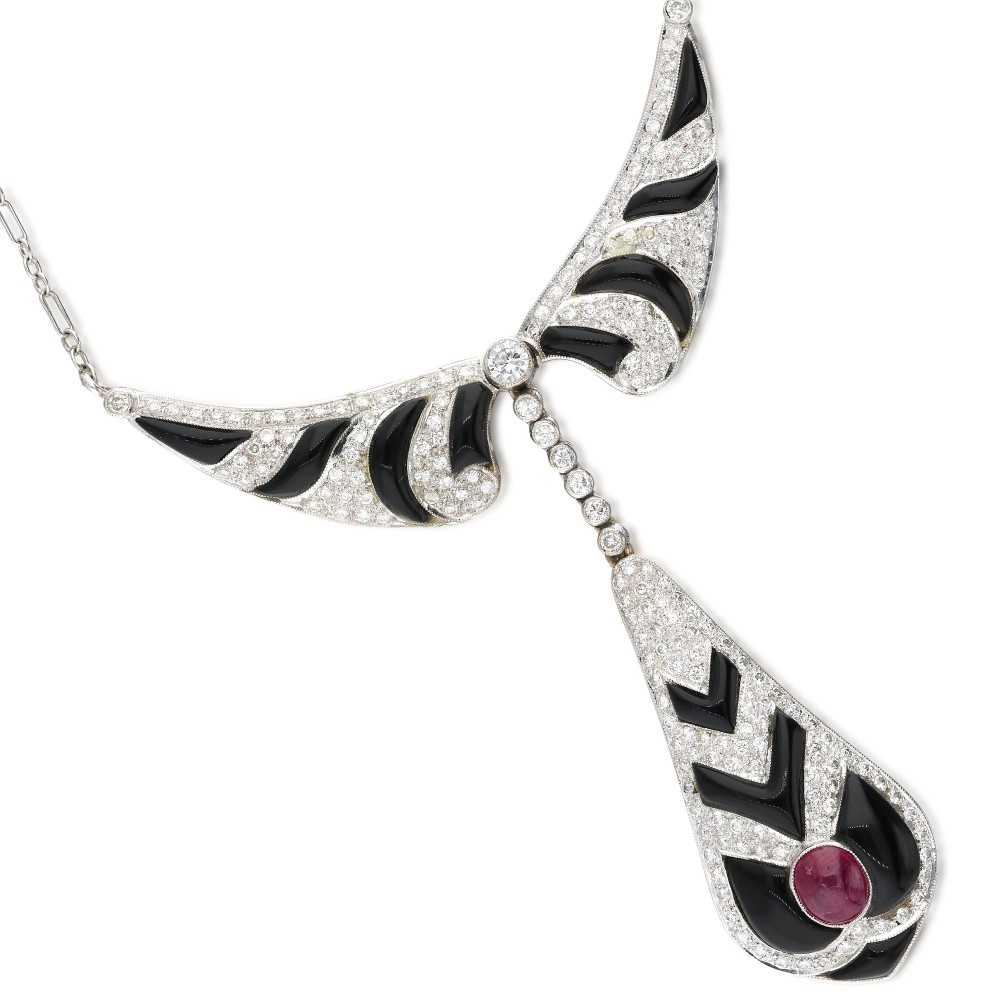 Featuring a ruby cabochon and black onyx, accented by round brilliant-cut diamonds.