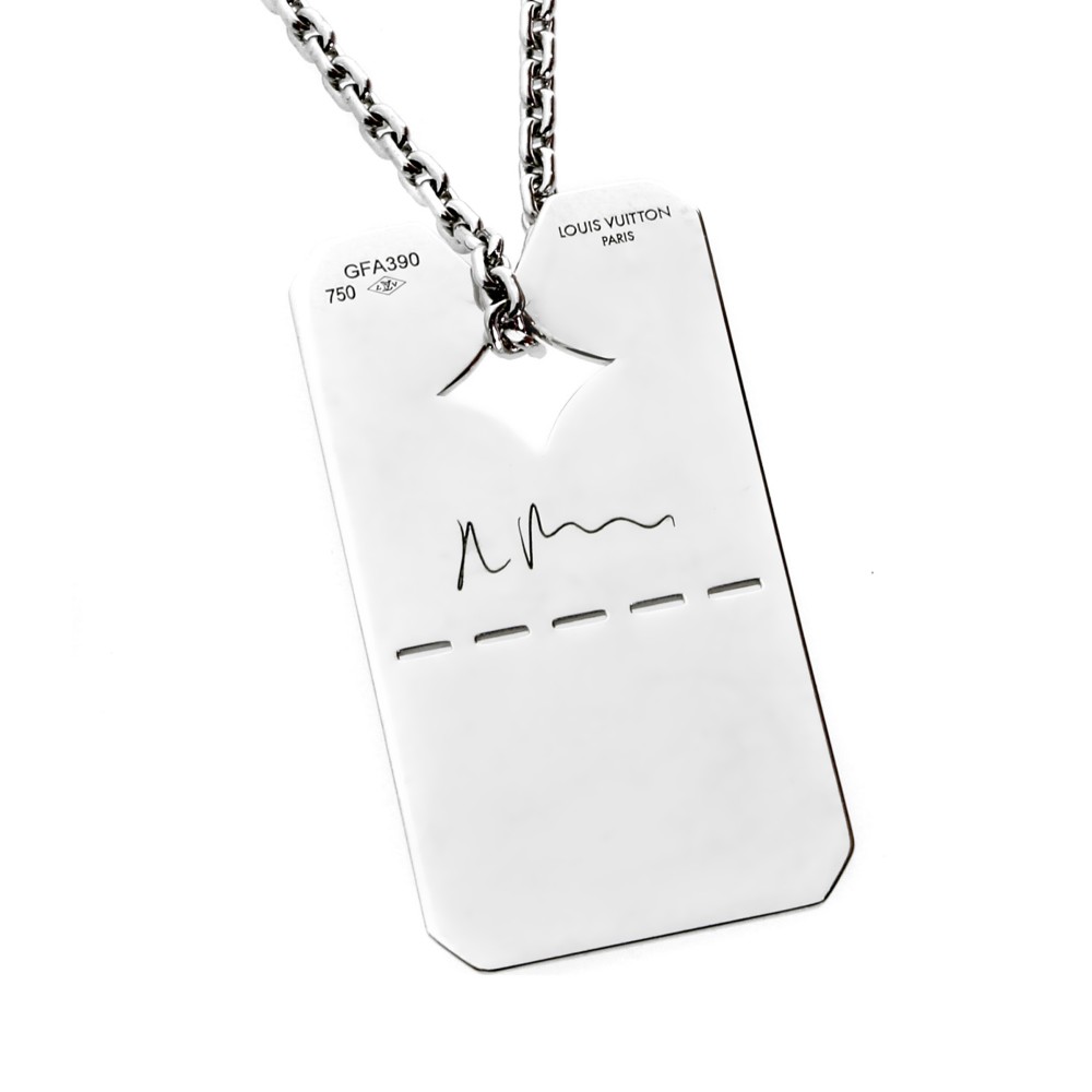 Of a tag, featuring laser-cut iconic Louis Vuitton monogram and logo.