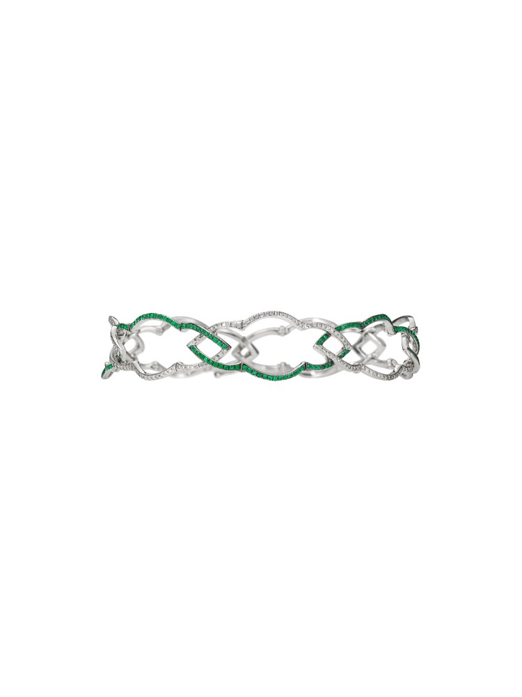 Composed of small brilliant emeralds and round brilliant-cut diamonds.