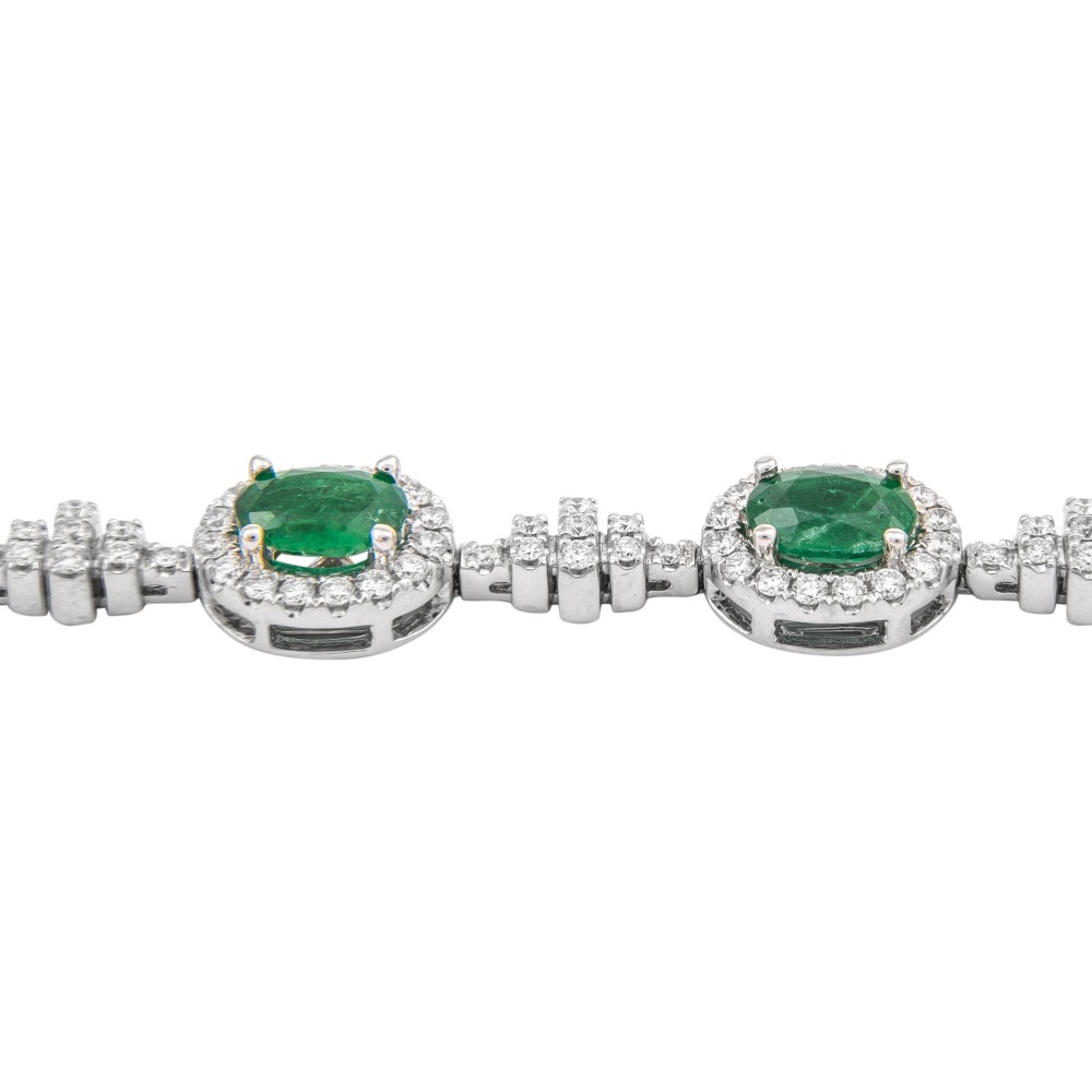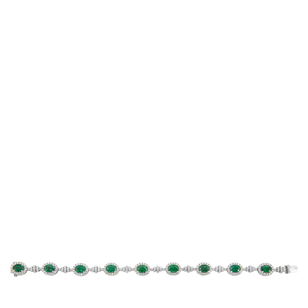Featuring 9 oval-shaped emeralds, accented by round brilliant-cut diamonds.