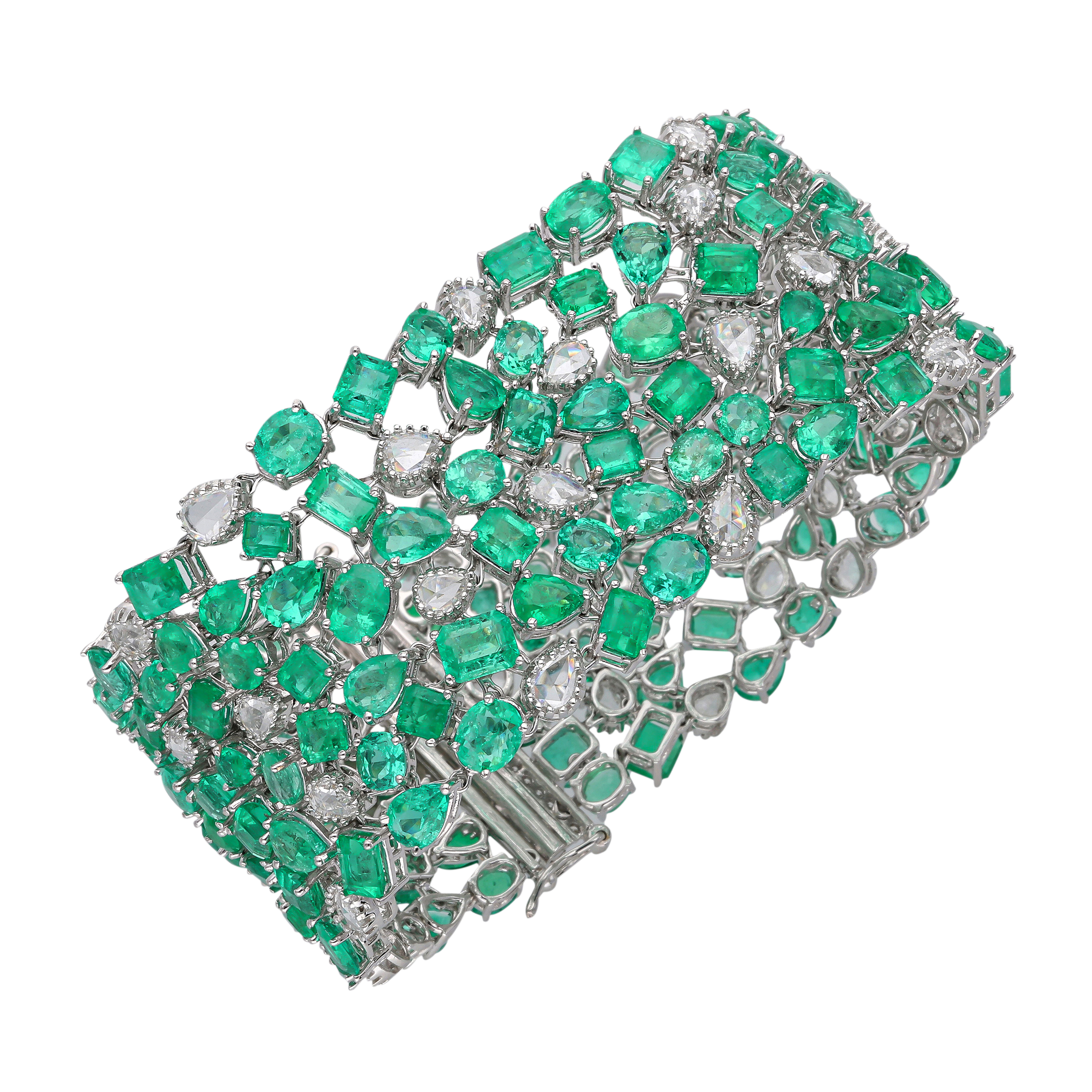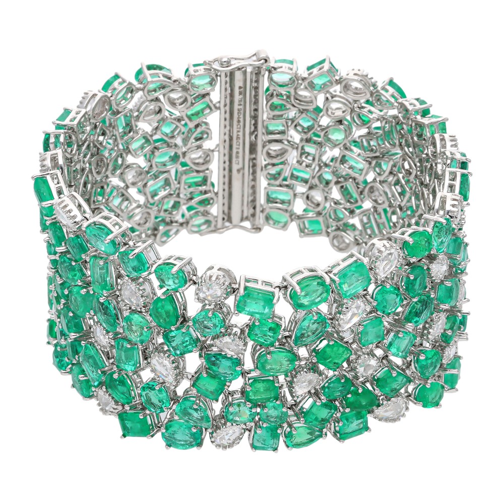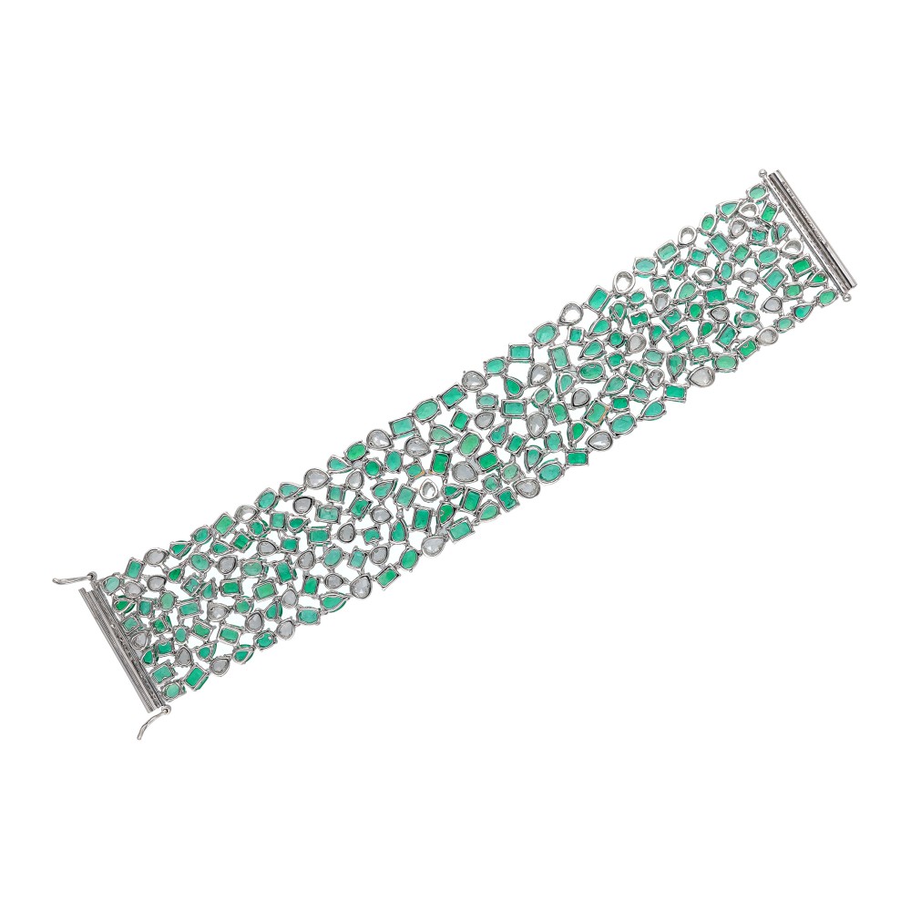 Wide bracelet set with faceted emeralds, round brilliant cut and rose cut diamonds.