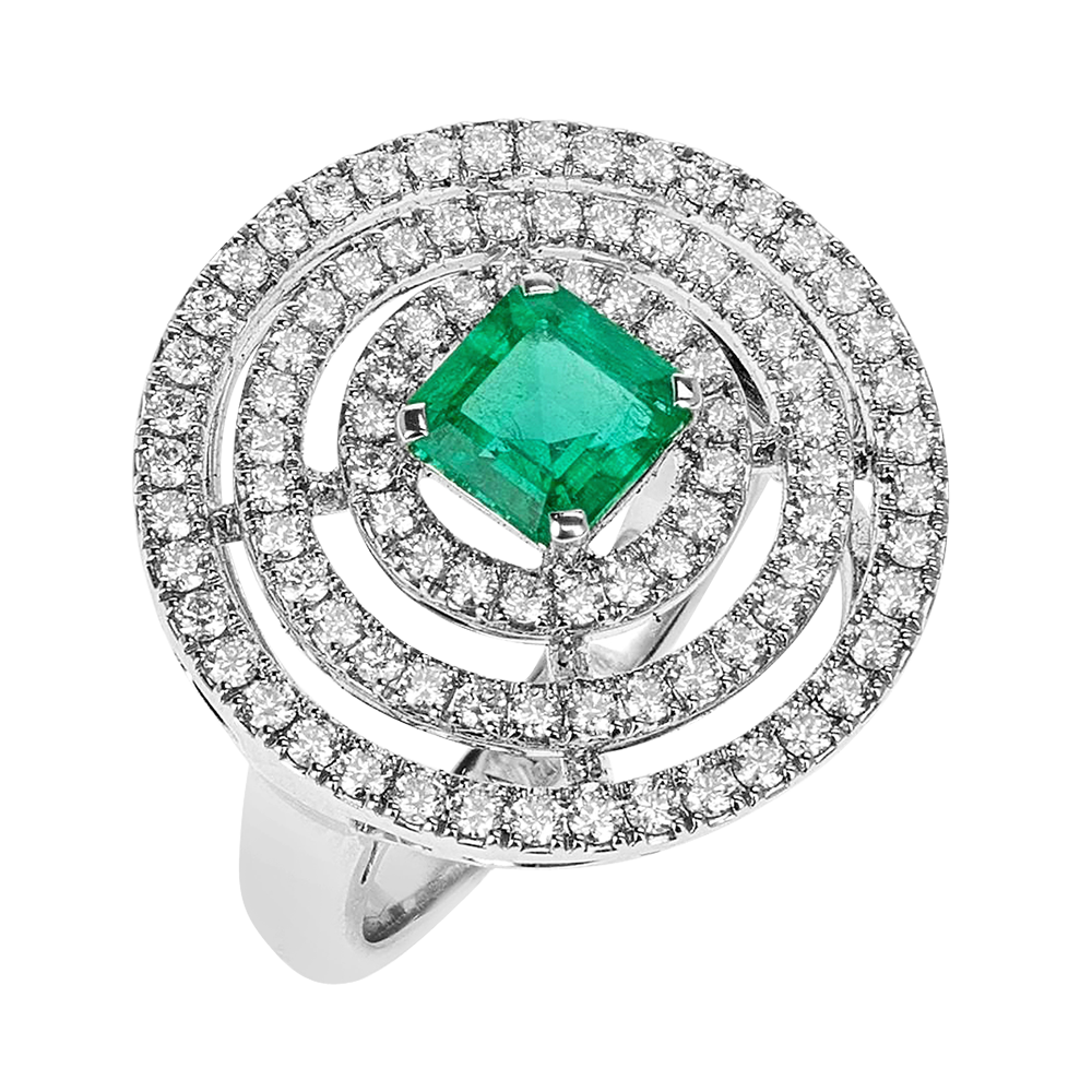 Centering a square cut emerald, surrounded by diamonds.