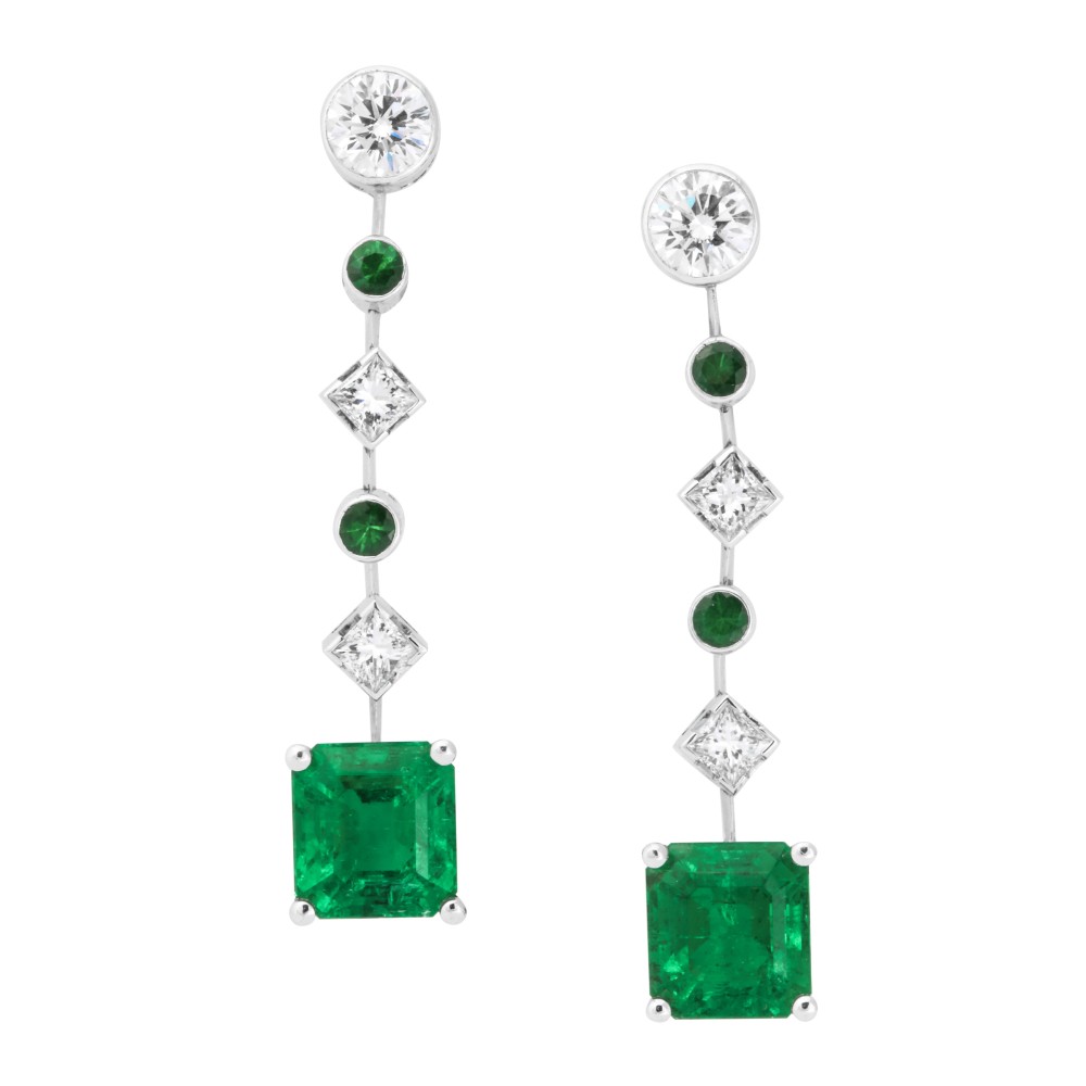 Featuring 2 cut-cornered square emerald, suspended by 4 bezel-set round emeralds, 4 princess-cut diamonds and 2 round bezel-set diamonds.