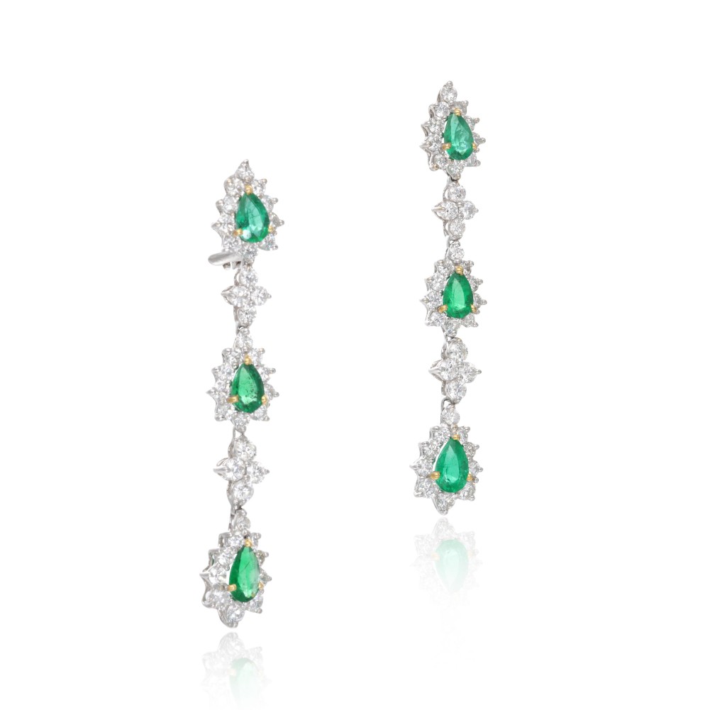 Each set with three pear-shaped emeralds, accented by round brilliant-cut diamonds.