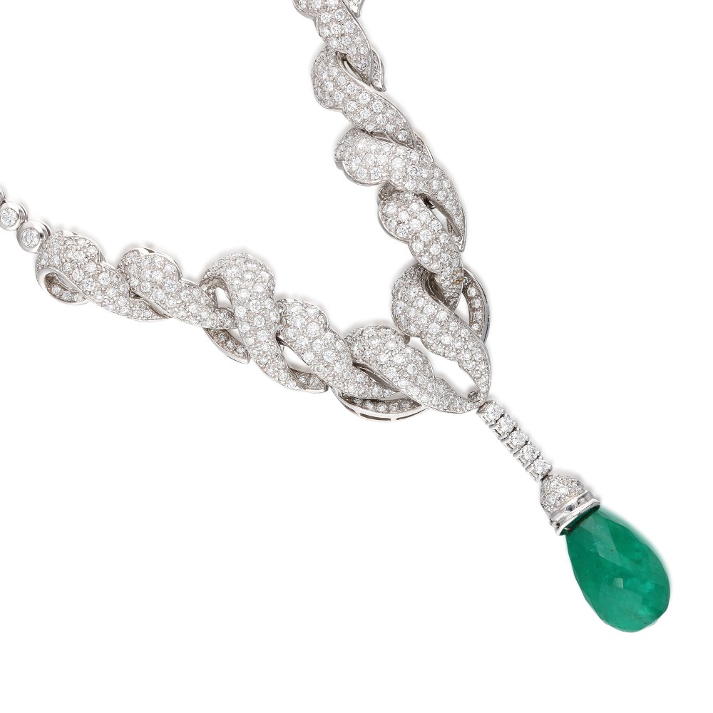 Centering a faceted, drop-shaped emerald and accented by round brilliant-cut diamonds.