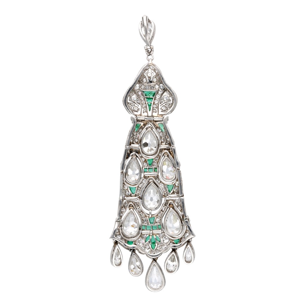 Composed of antique-cut pear-shaped diamonds, accented by Old European-cut diamonds and emeralds.