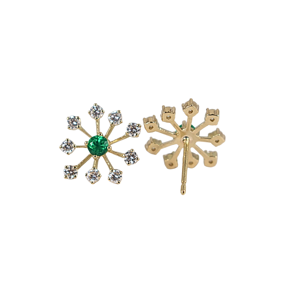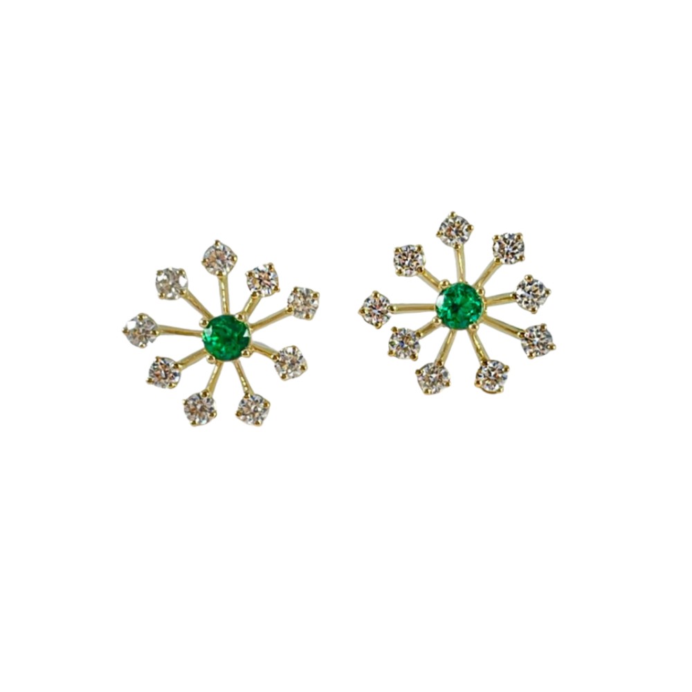 Designed as starbursts, each centering a round emerald with 9 round brilliant-cut diamonds.