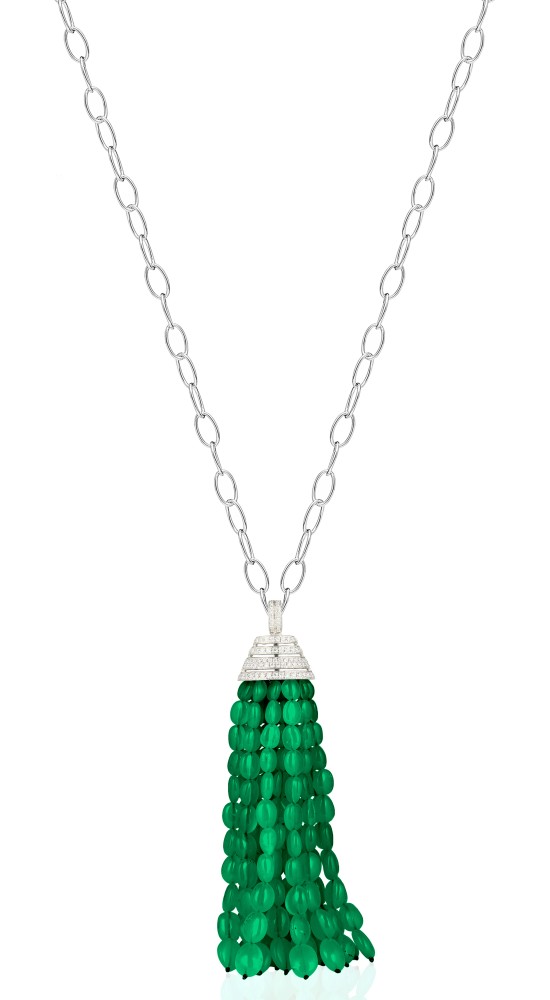 The tassel comprising multiple strands of tumbled emerald beads, accented with a round diamond-set cap and bail, suspended from a detachable white gold chain.