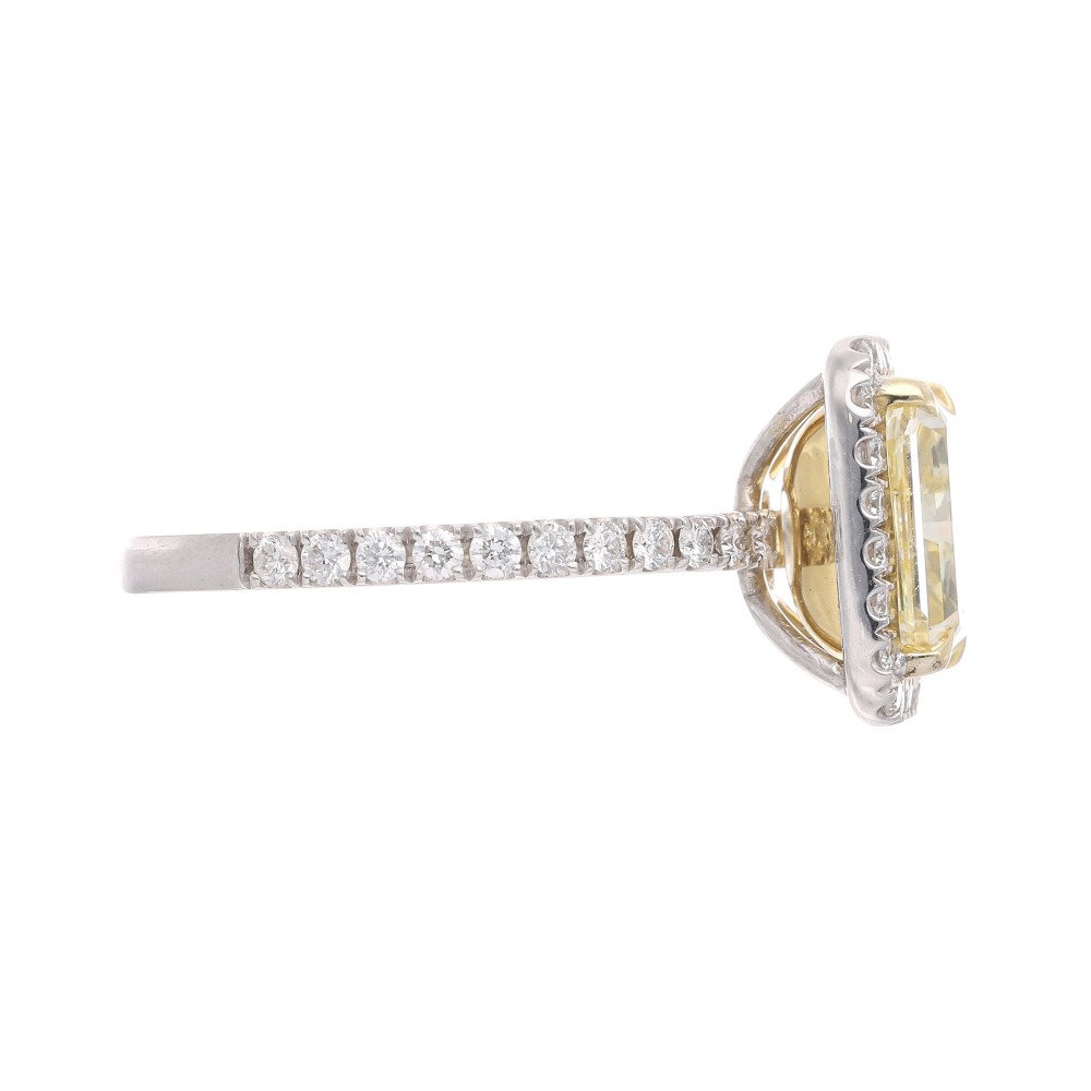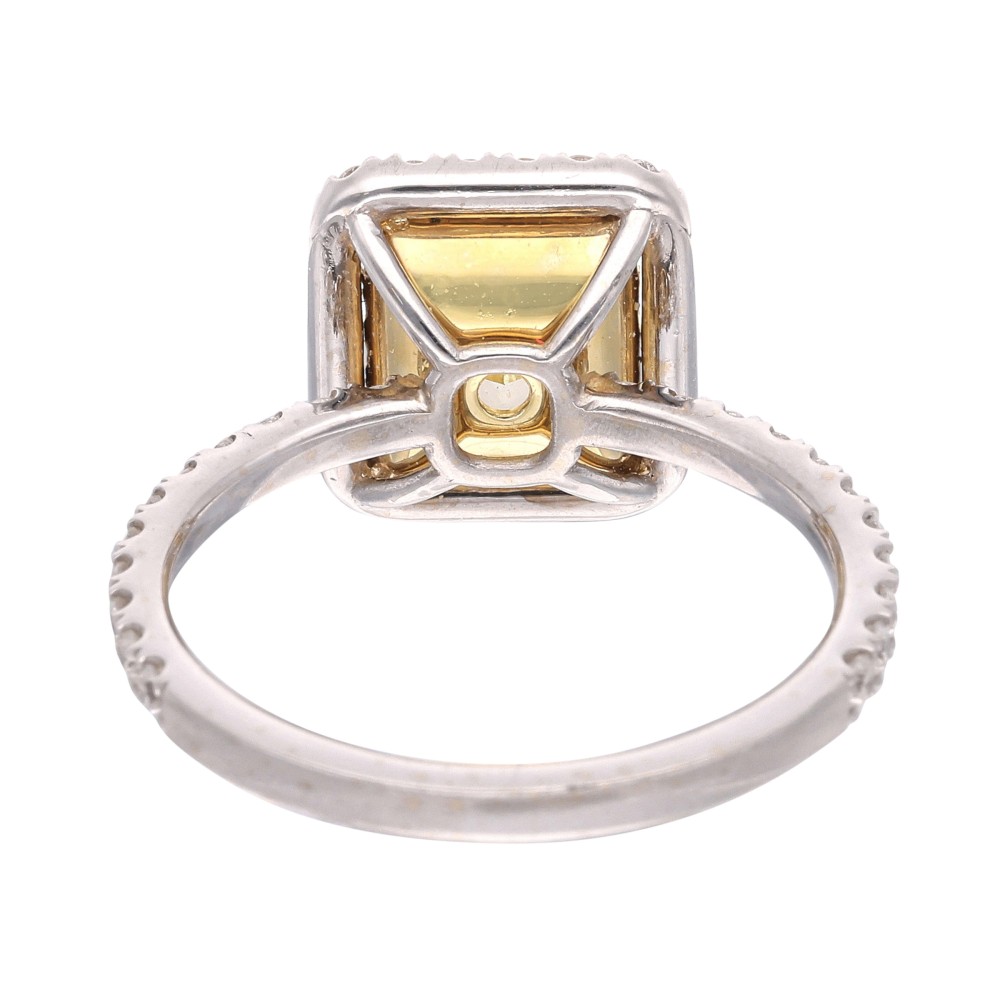 Centering a radiant cut yellow diamond, accented by 46 round brilliant cut diamonds.
