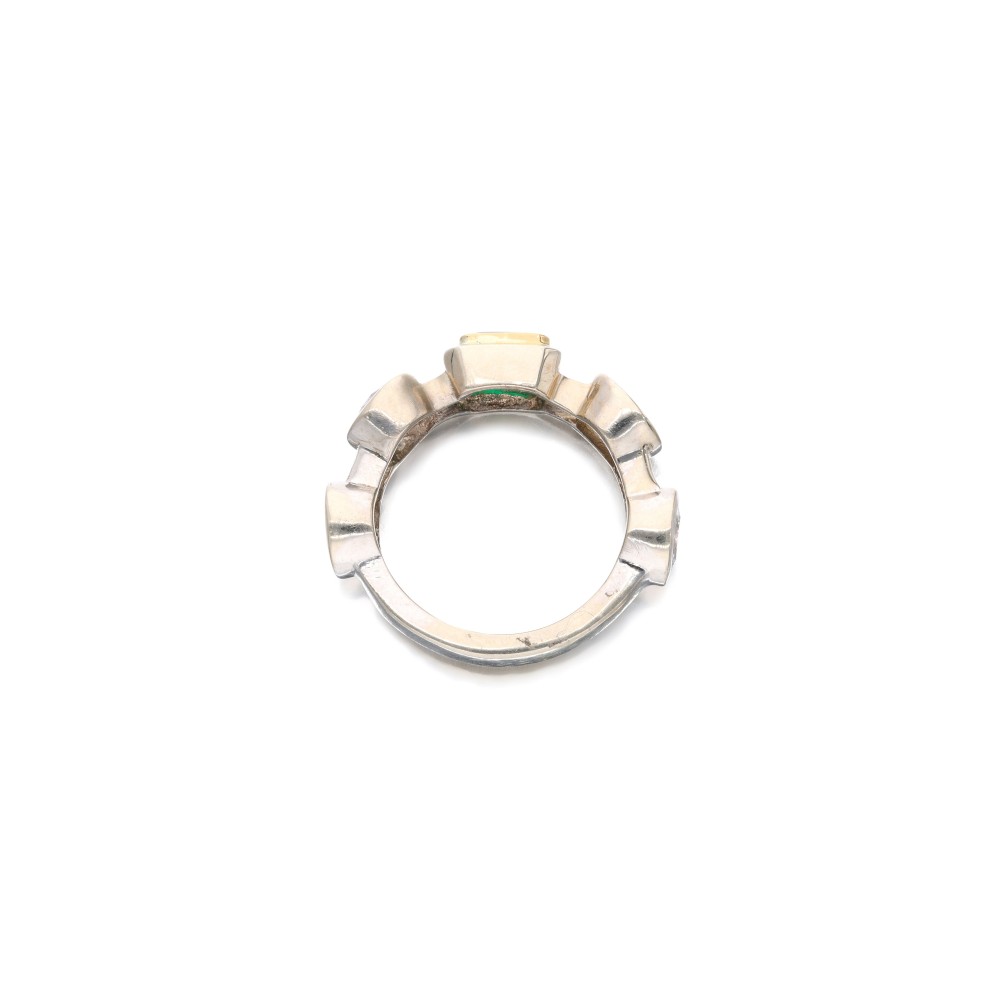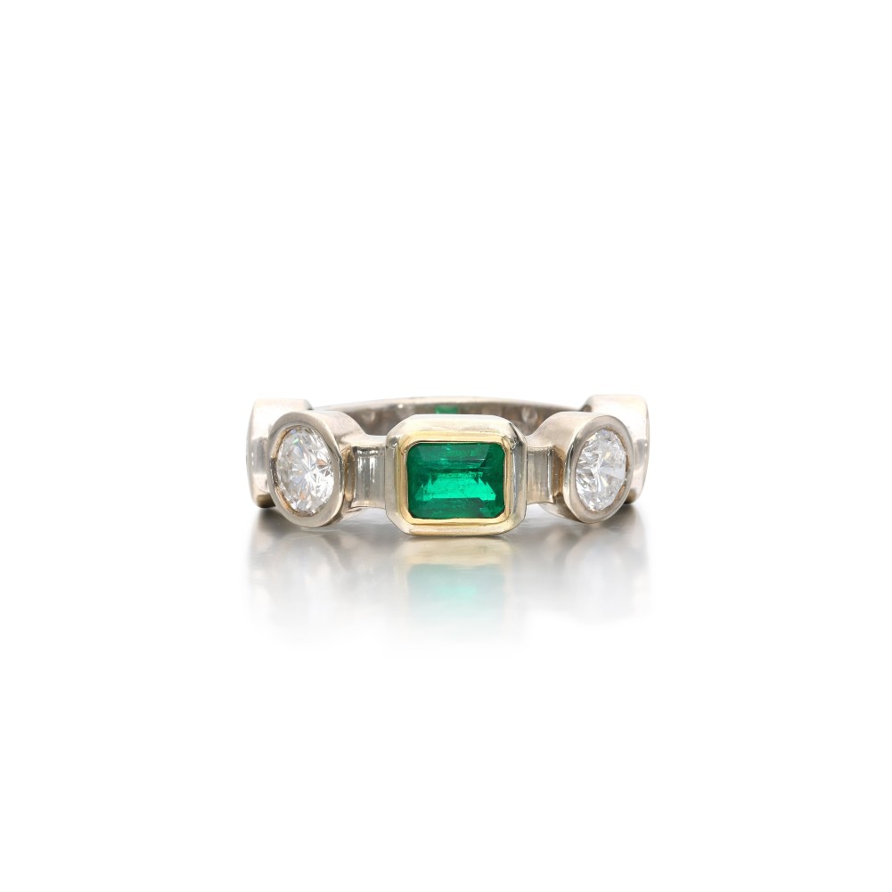 Composed of an emerald-cut emerald, accented by round brilliant-cut diamonds.