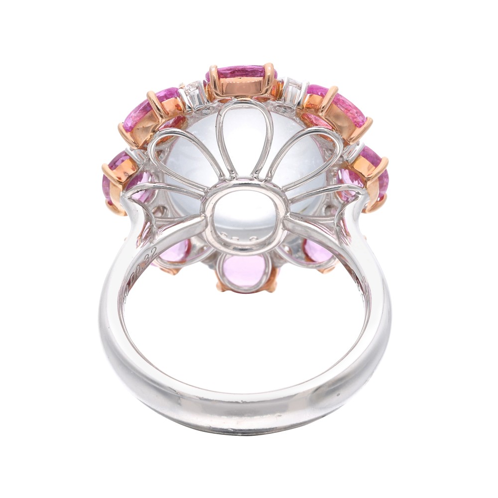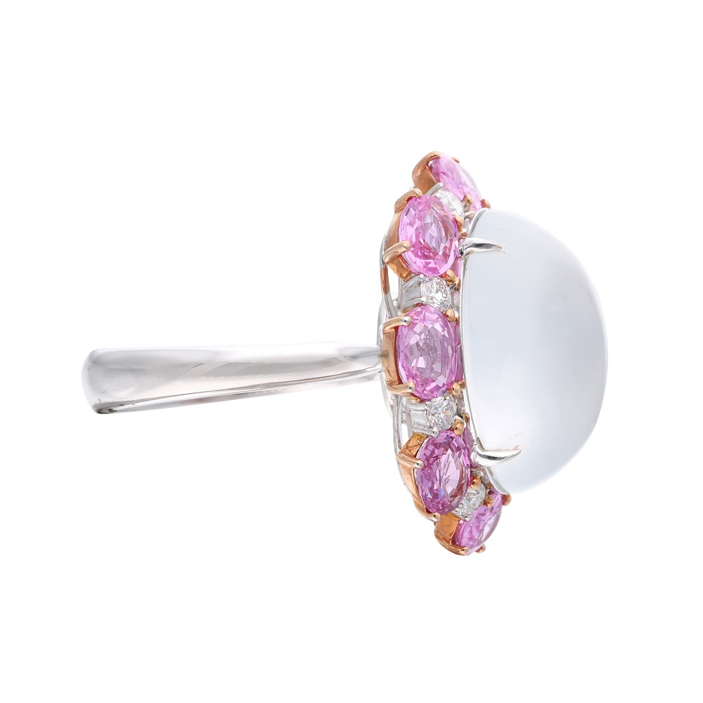Centering an oval cabochon colorless jadeite jade, accented by pink sapphires and diamonds.