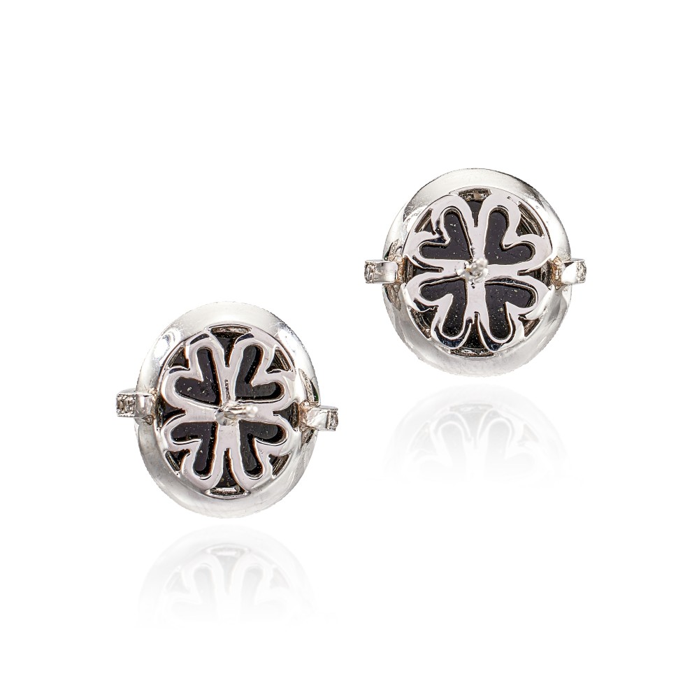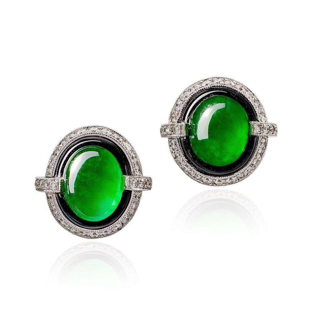Centering an oval jadeite, framed by onyx and 68 round diamonds.