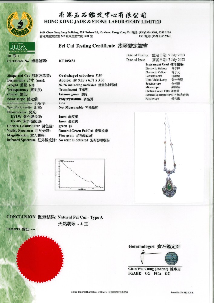 - Accompanied by Hong Kong Jade & Stone Laboratory certificate no. KJ 105683, dated 7 July 2023, stating that the jadeite is tested natural, known in the trade as “A Jade”