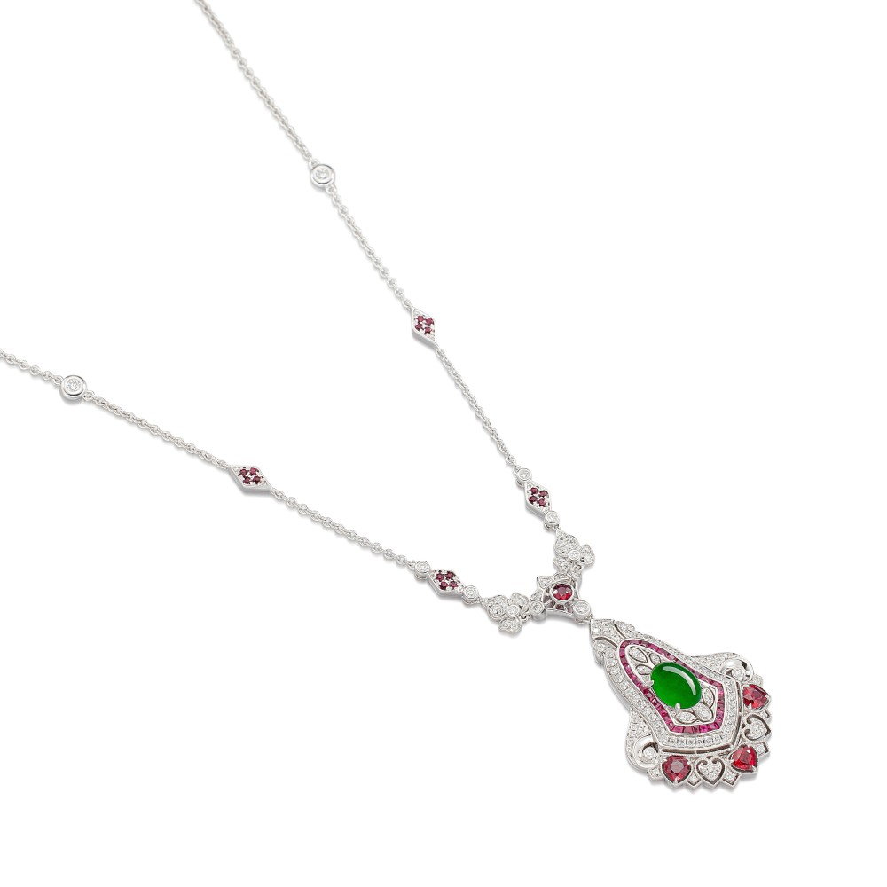 Featuring an oval-shaped cabochon jadeite, set with rubies, colored gemstones and diamonds.
