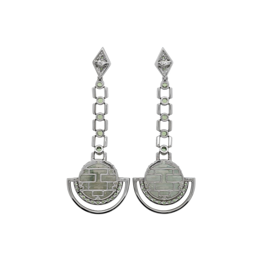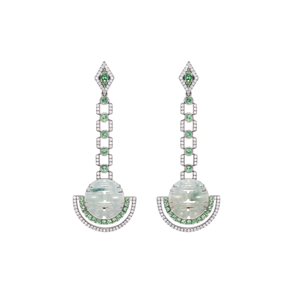 Featuring a jadeite craved as the Chinese character “?? with the meaning of happiness and joy, suspended from a diamond-shaped stud and chain composed of tsavorite garnets and round diamonds.