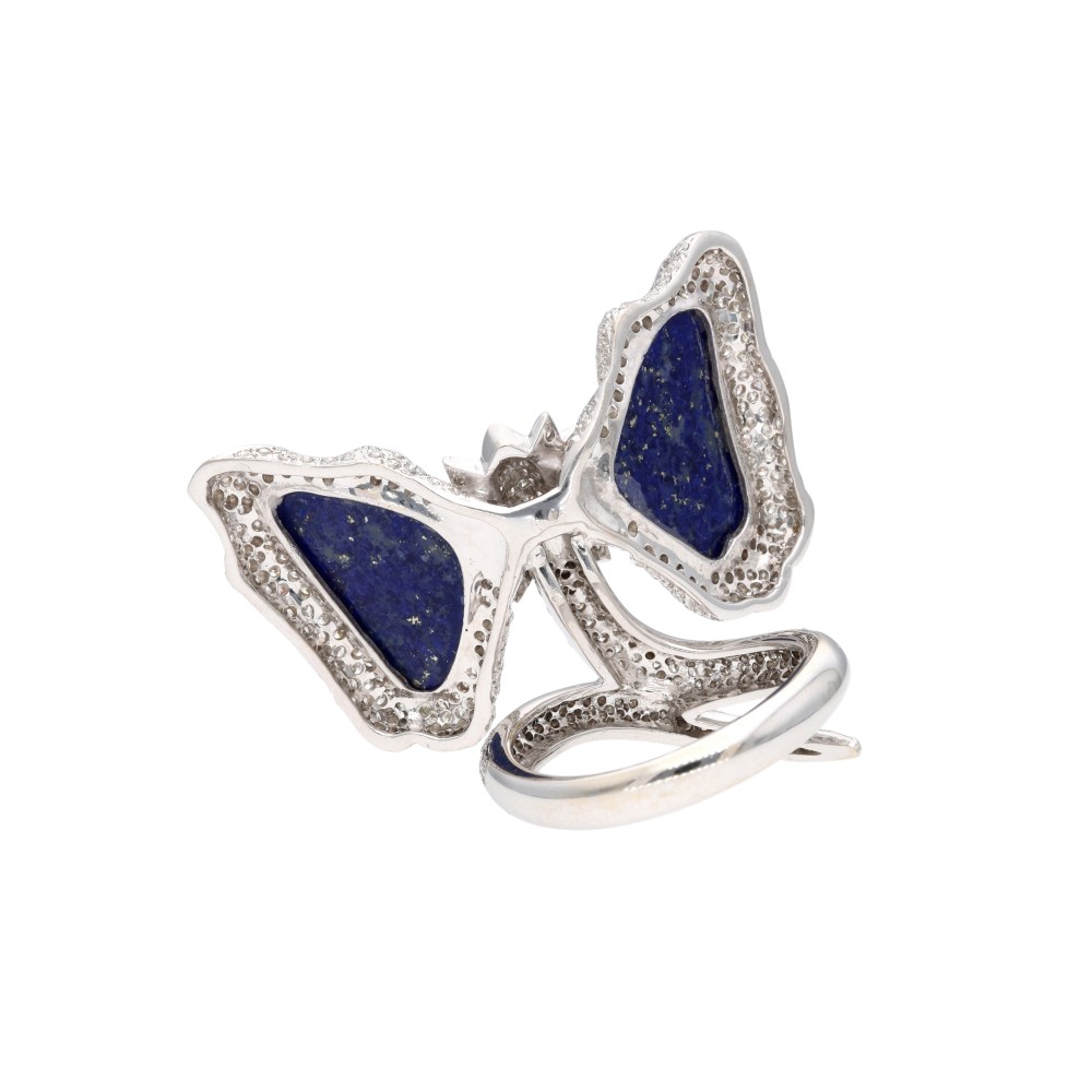 Designed as a butterfly with lapis lazuli wings, accented by diamonds.