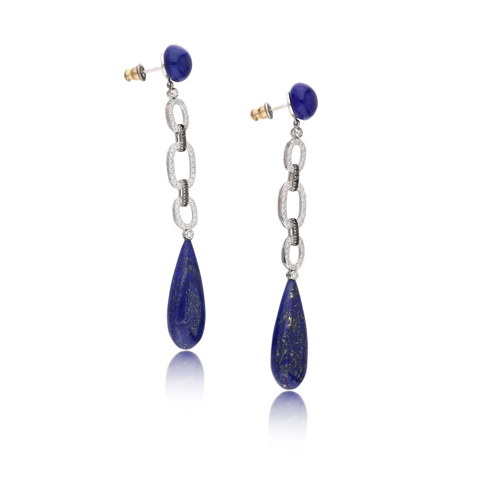 Drop-shaped earrings composed of lapis lazuli, accented by black and colorless diamonds.