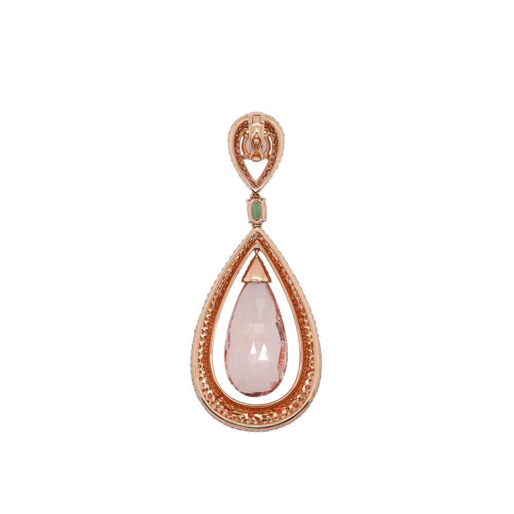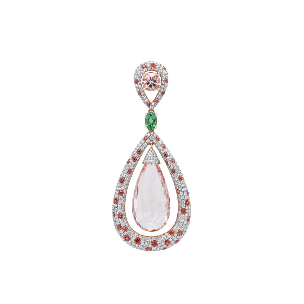 Of double teardrop design, centering a morganite, accented by orange sapphire, tsavorite and round diamonds.