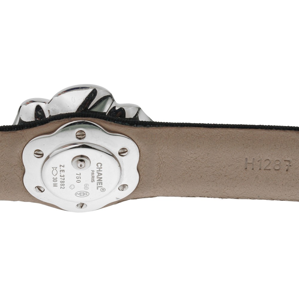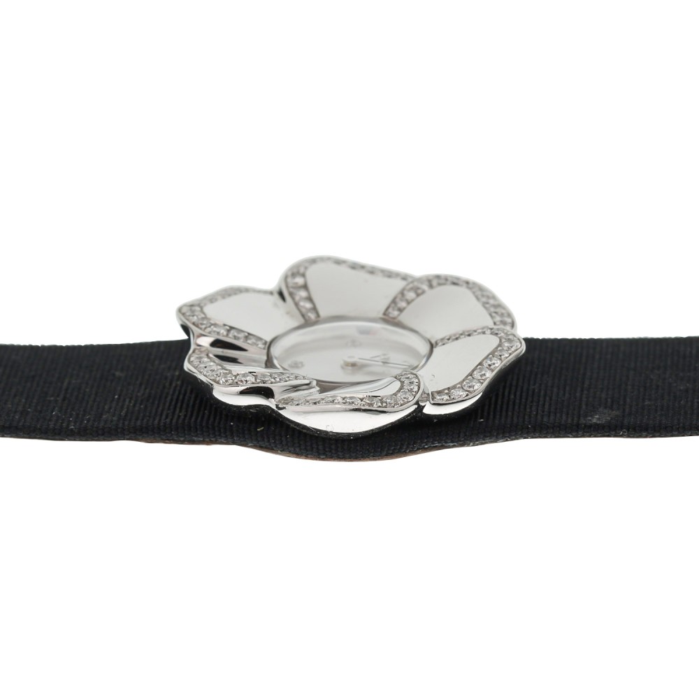 Designed as a camellia flower, adorned with round brilliant cut diamonds, the dial is mother of pearl and set with 4 additional diamonds.
