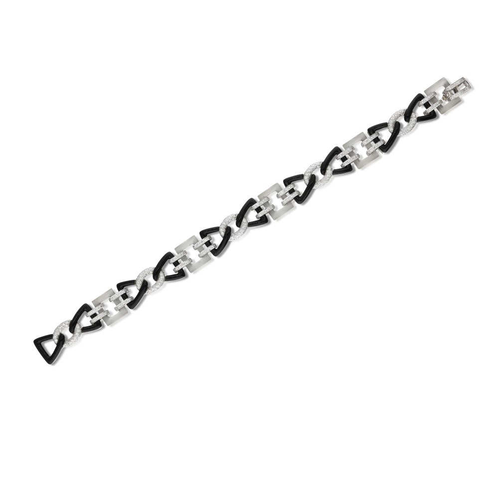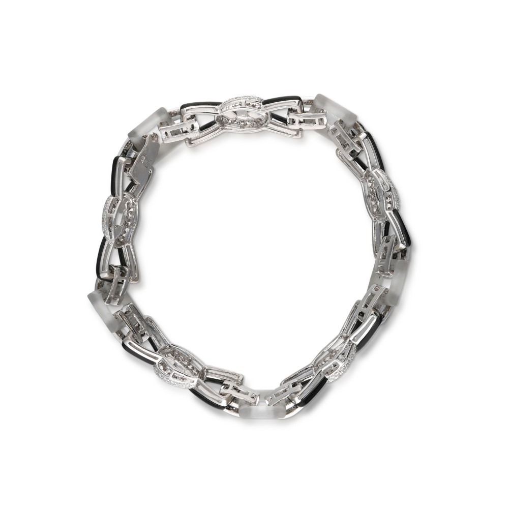 Composed of onyx and rock crystal quartz components with diamond accents.