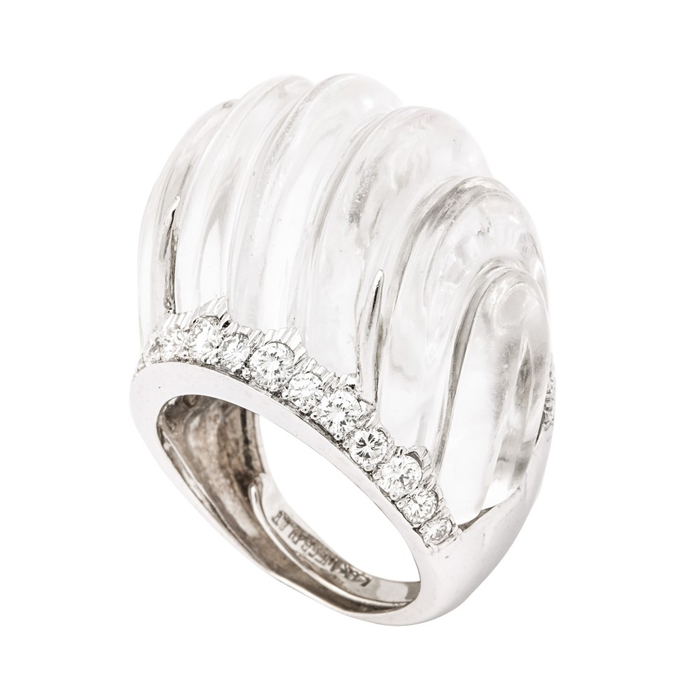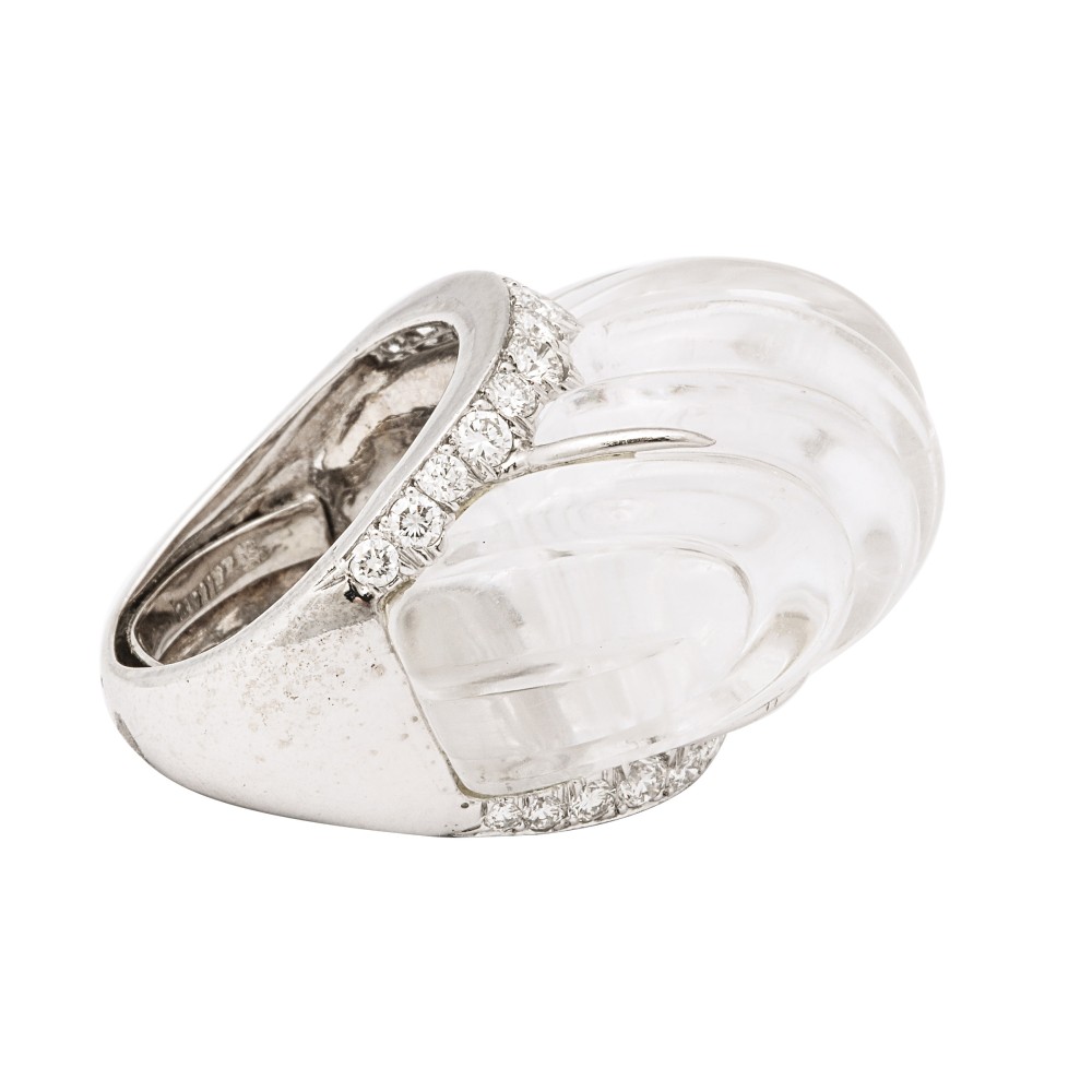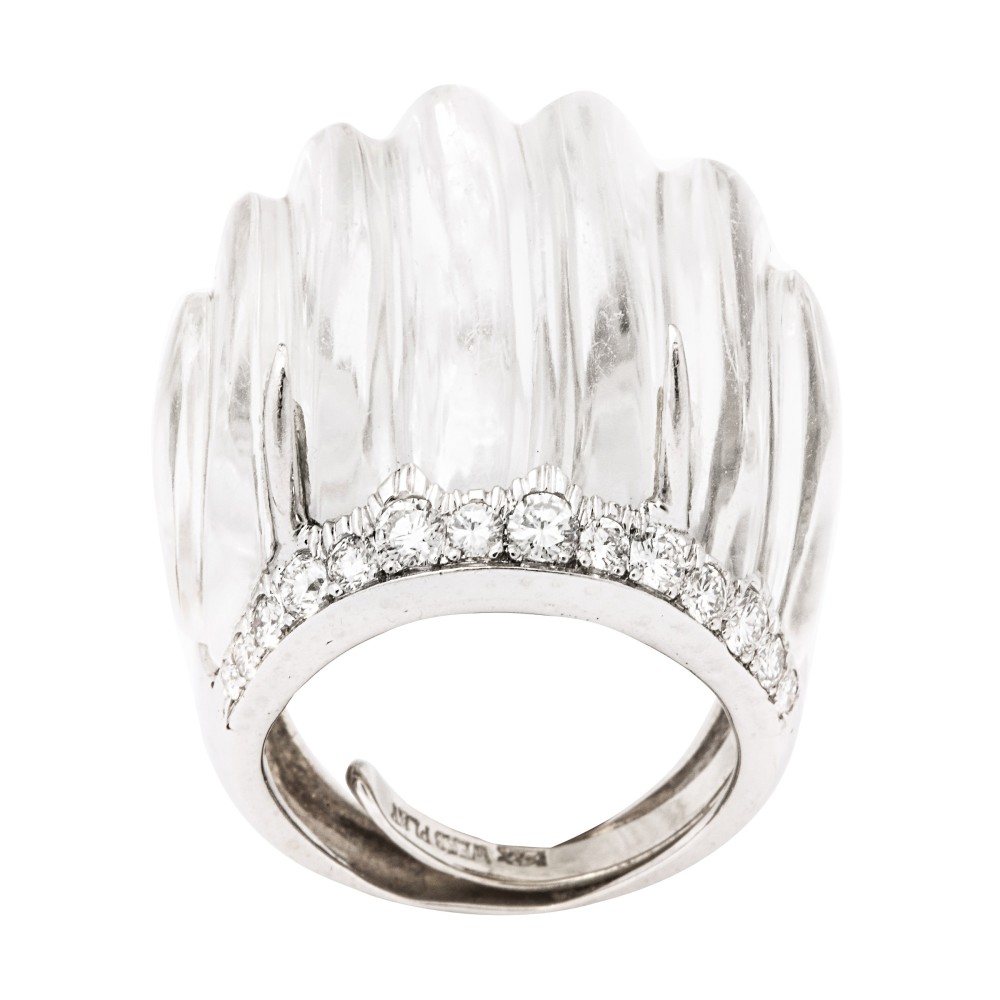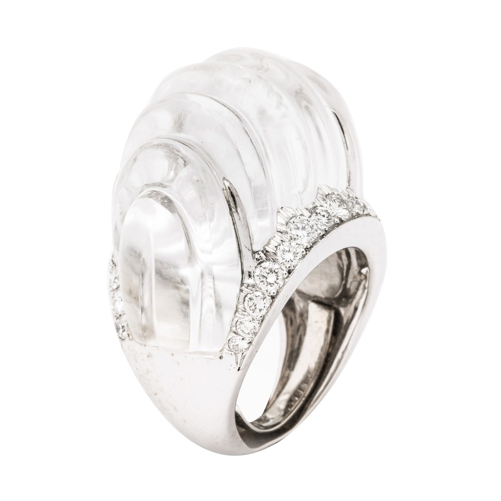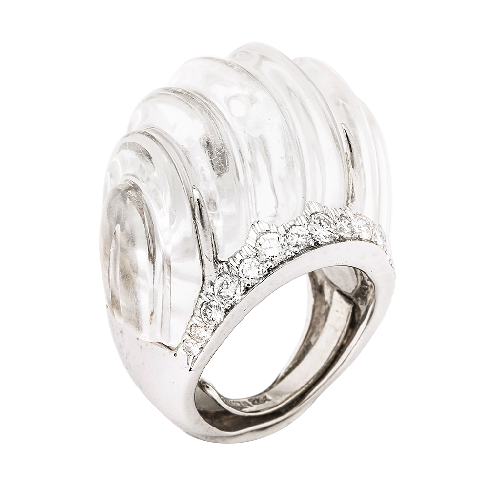 Fluted rock crystal framed with diamonds ring.