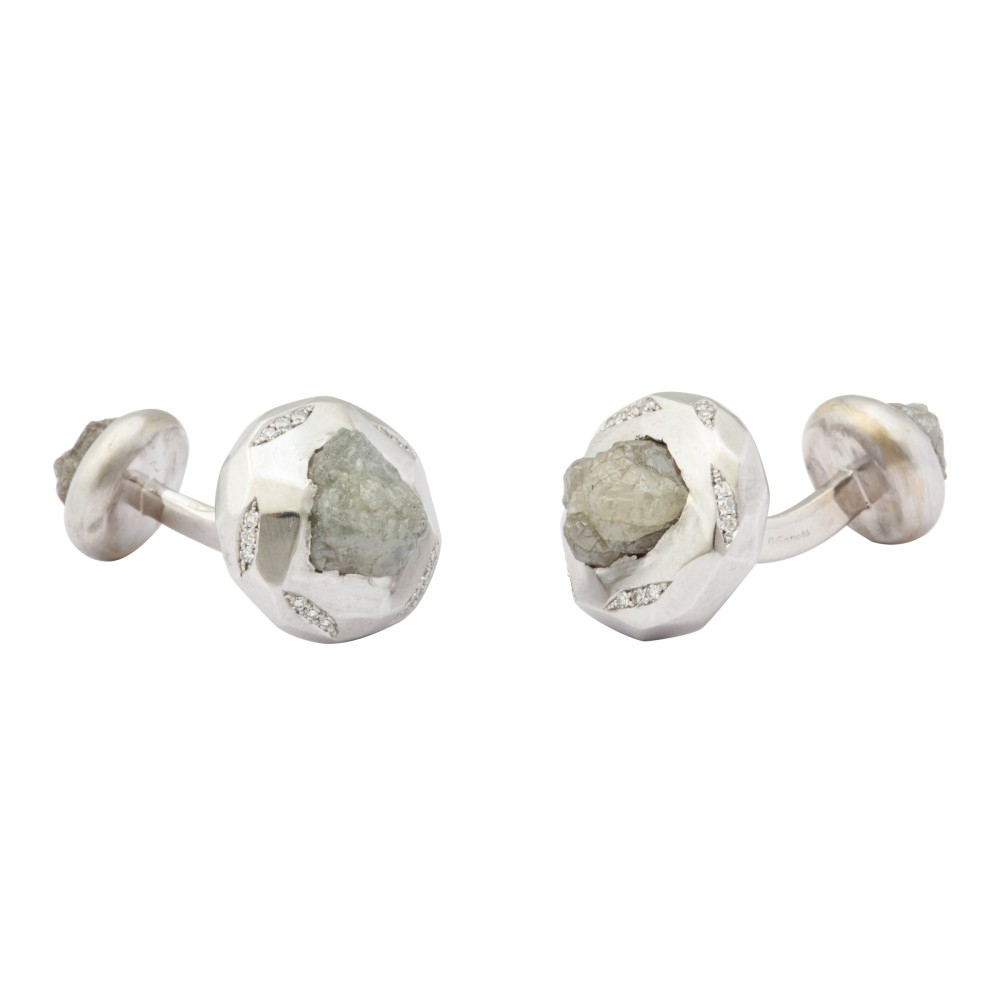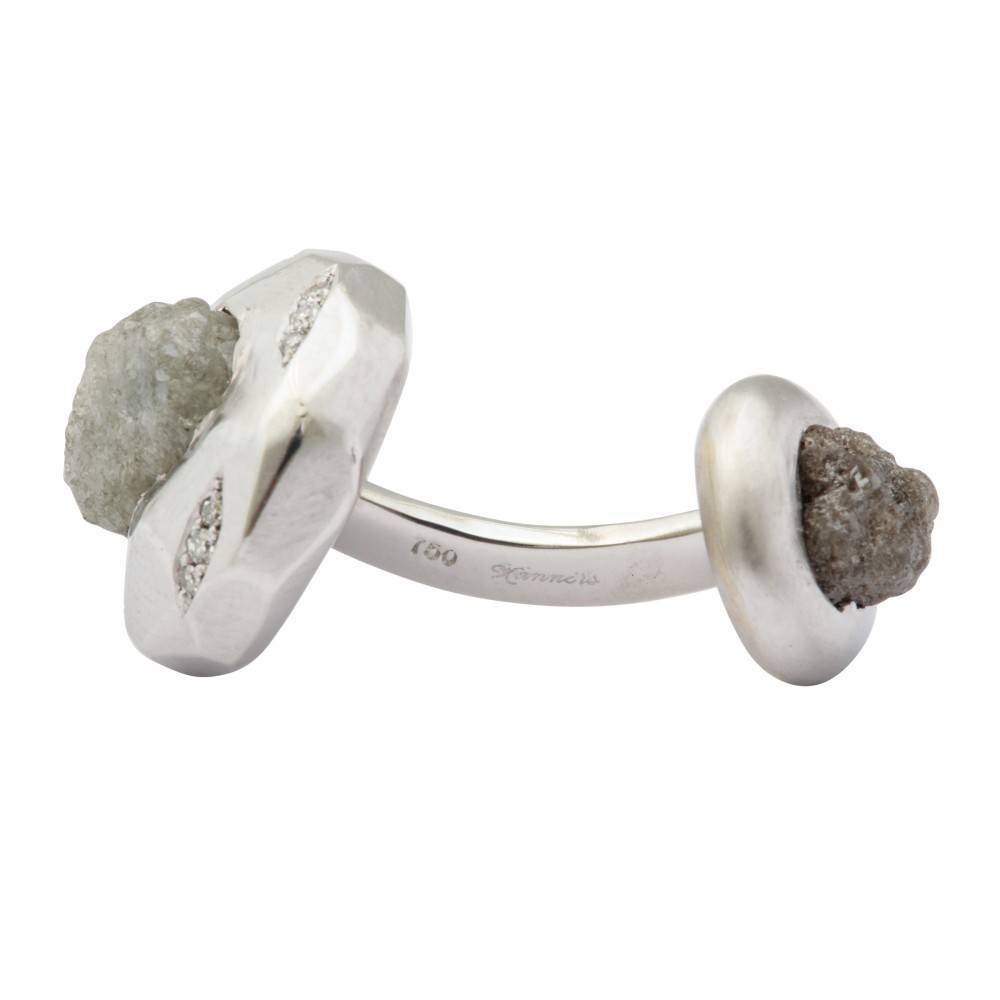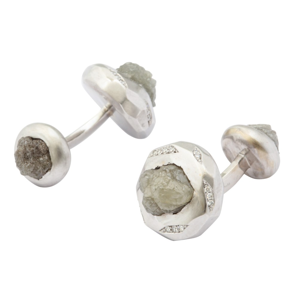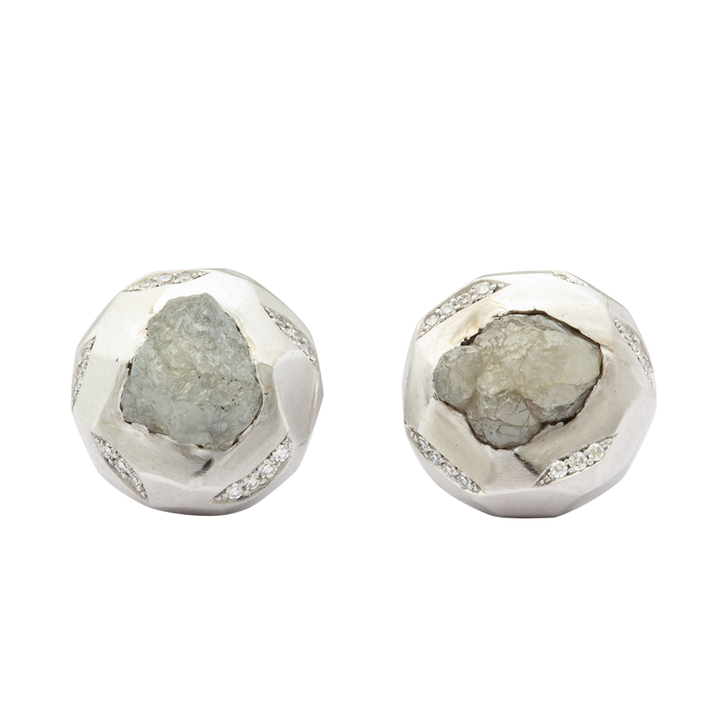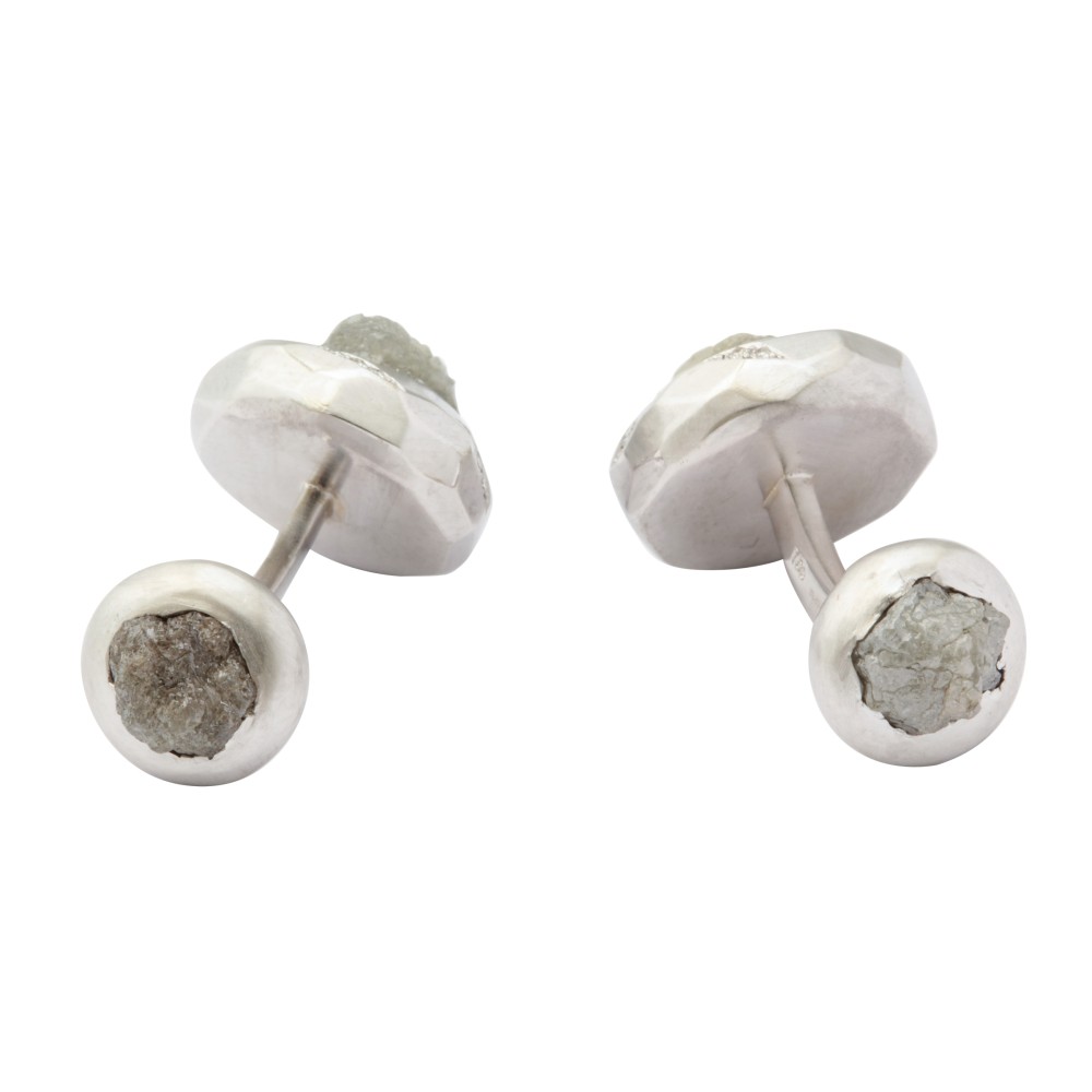 Set with 2 rough diamonds on each, accented by small round diamonds.