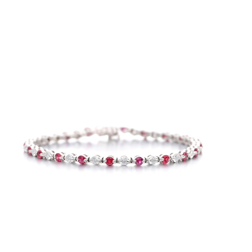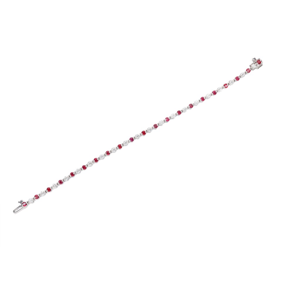 Composed of round-cut rubies and round brilliant-cut diamonds.