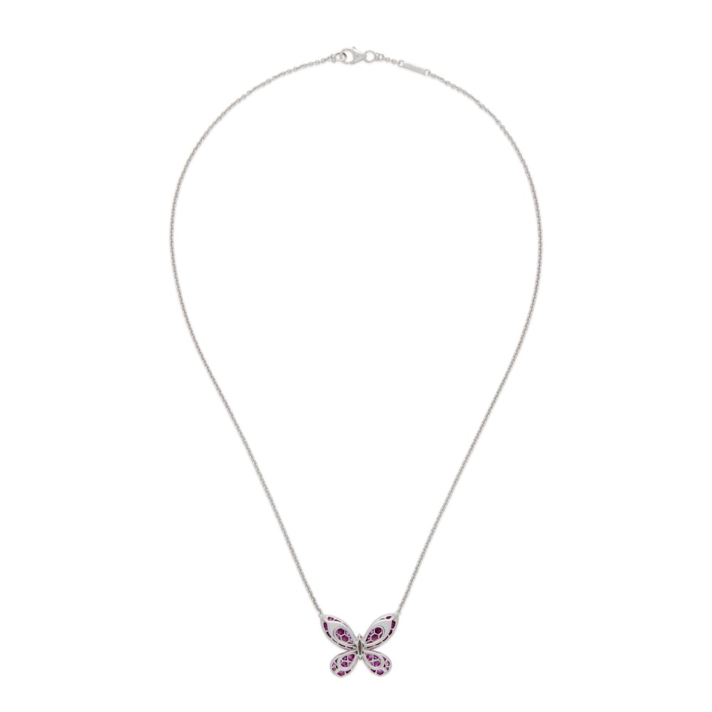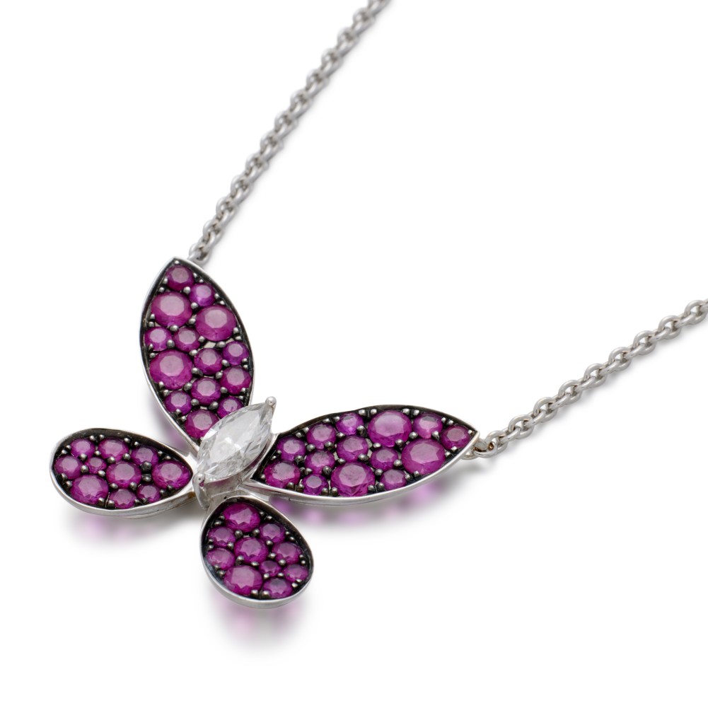 Designed as a butterfly, composed of round rubies and a marquise diamond.
