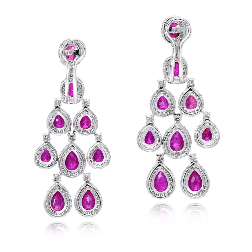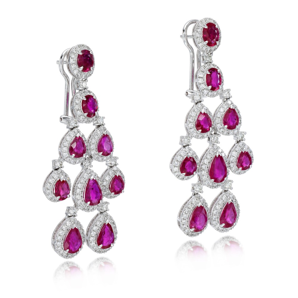 Pear-shaped and oval rubies and round brilliant diamond micro-set halo fancy drop earrings.