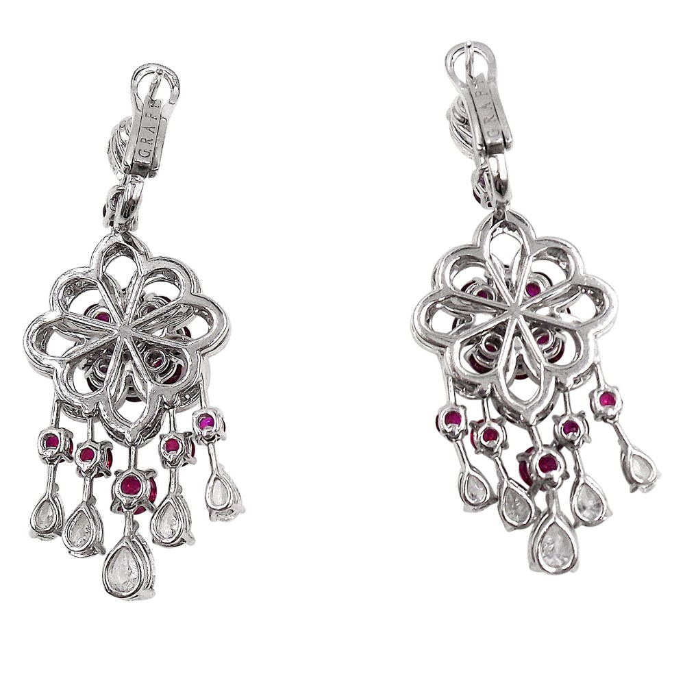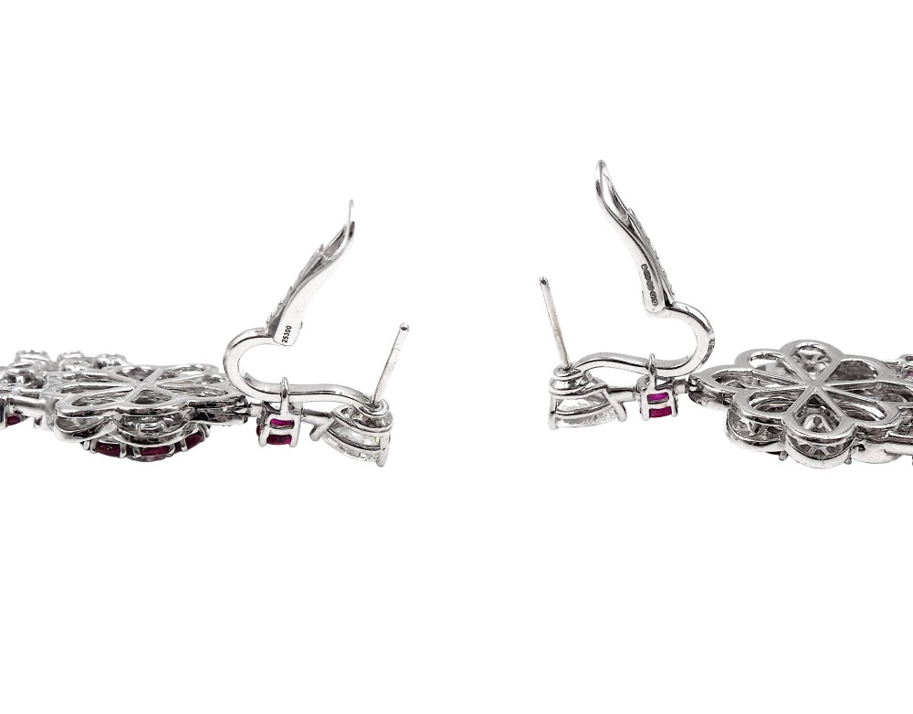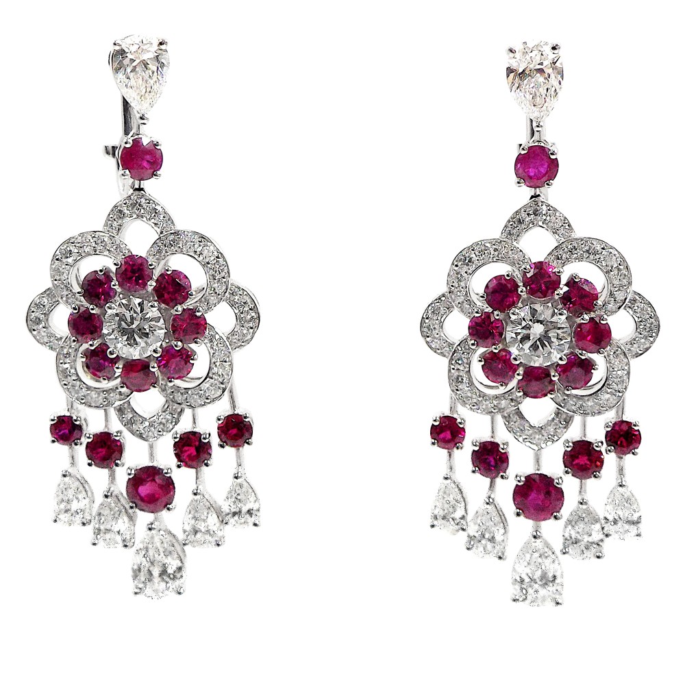 Centering 2 round brilliant-cut diamonds and 28 round rubies, accented by round and pear-shaped diamonds.