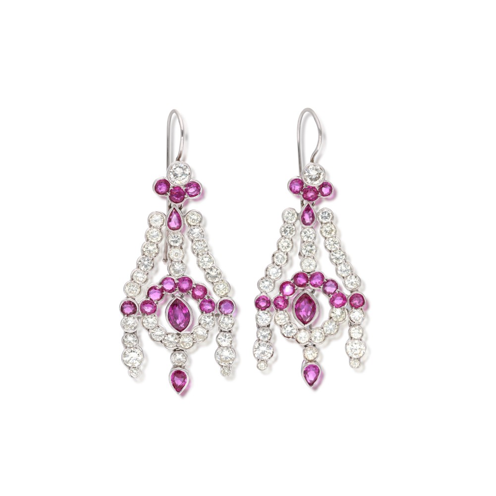 Composed of round diamonds and round, pear and marquise cut rubies.