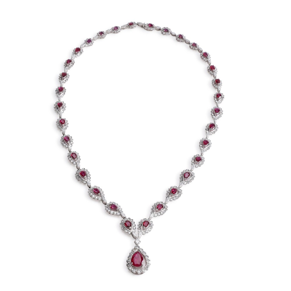 Composed of pear-shaped rubies and round brilliant, single and marquise-cut diamonds.