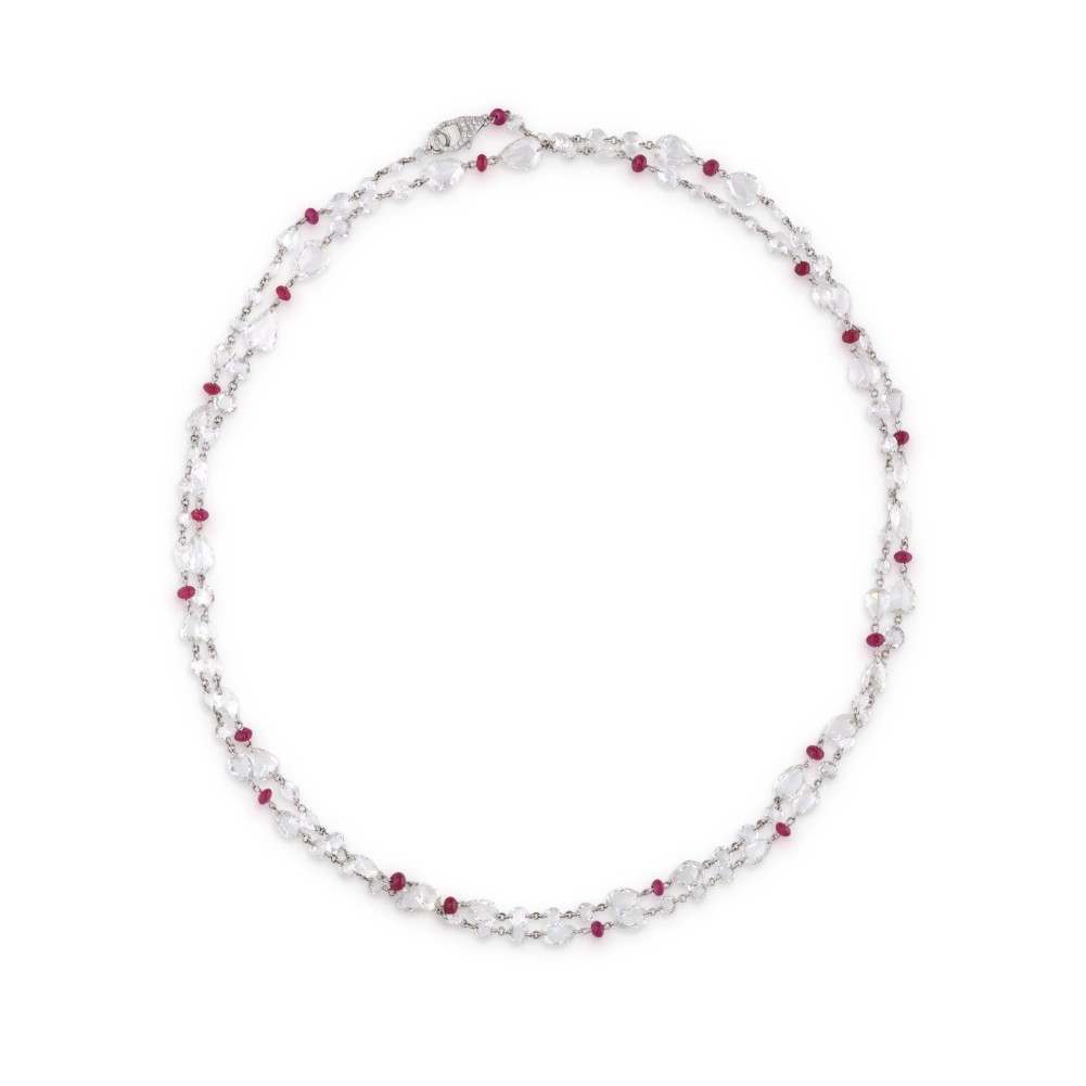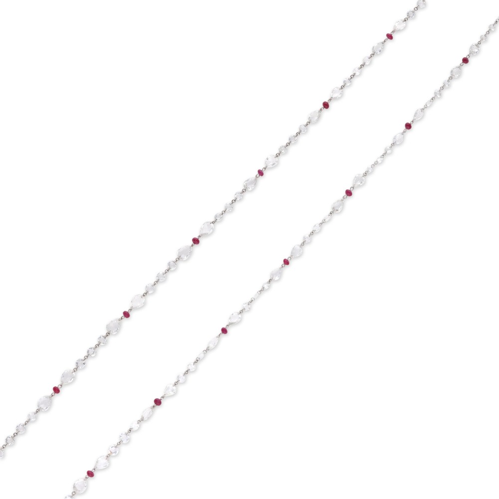 Composed of round and pear-shaped rose-cut diamonds, accented by ruby beads.
