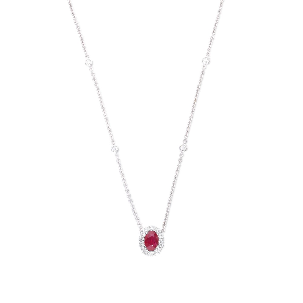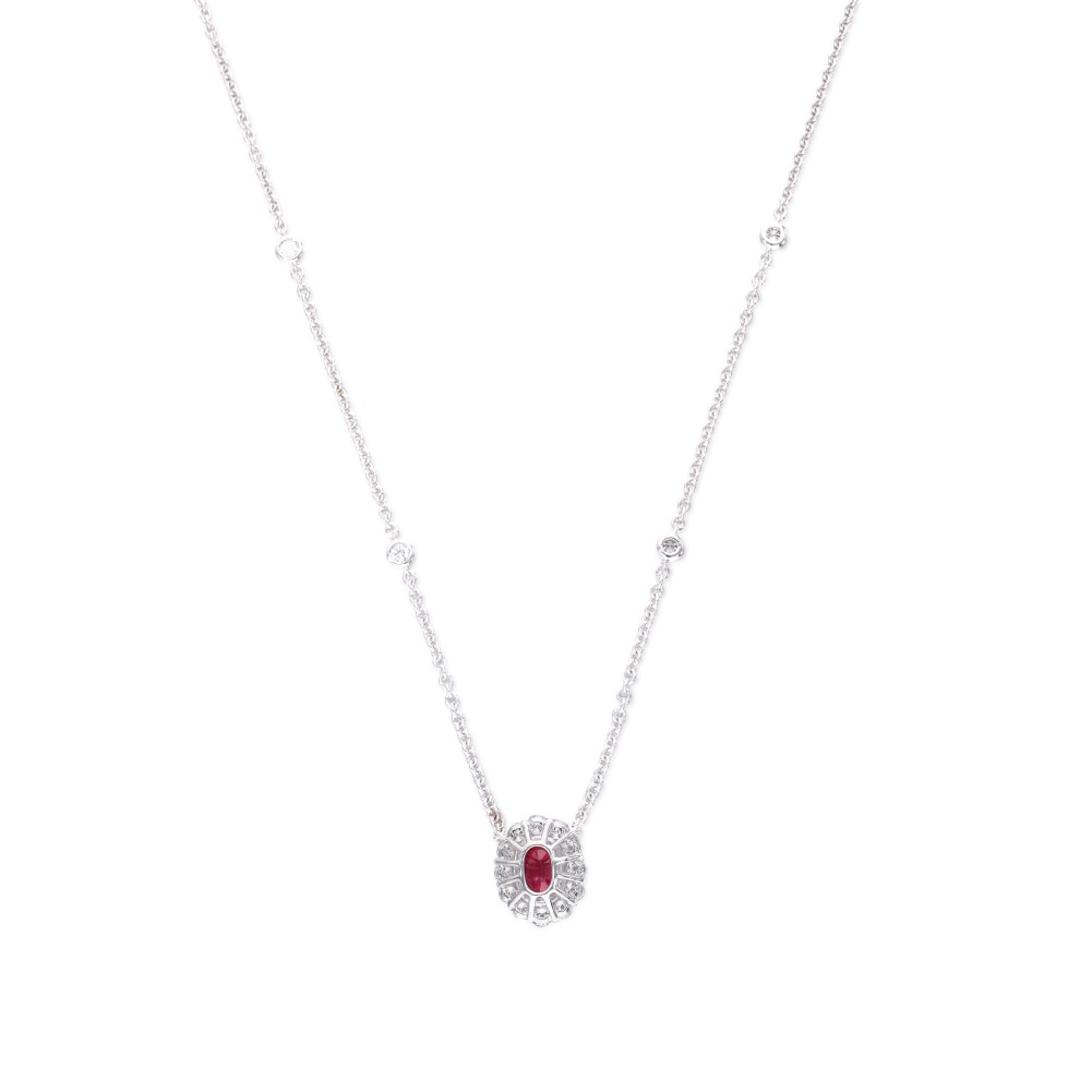 Centering an oval ruby, surrounded by round brilliant-cut diamonds, additional bezel-set round diamonds on the chain.