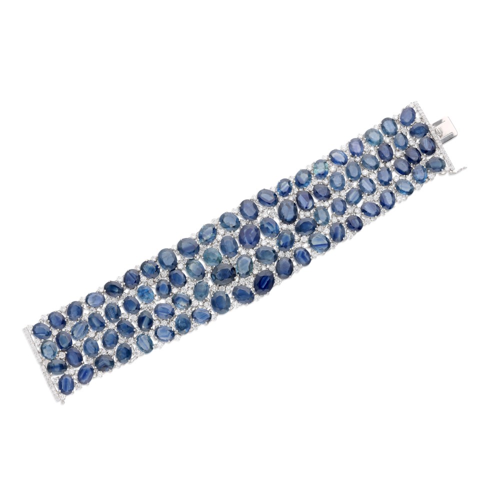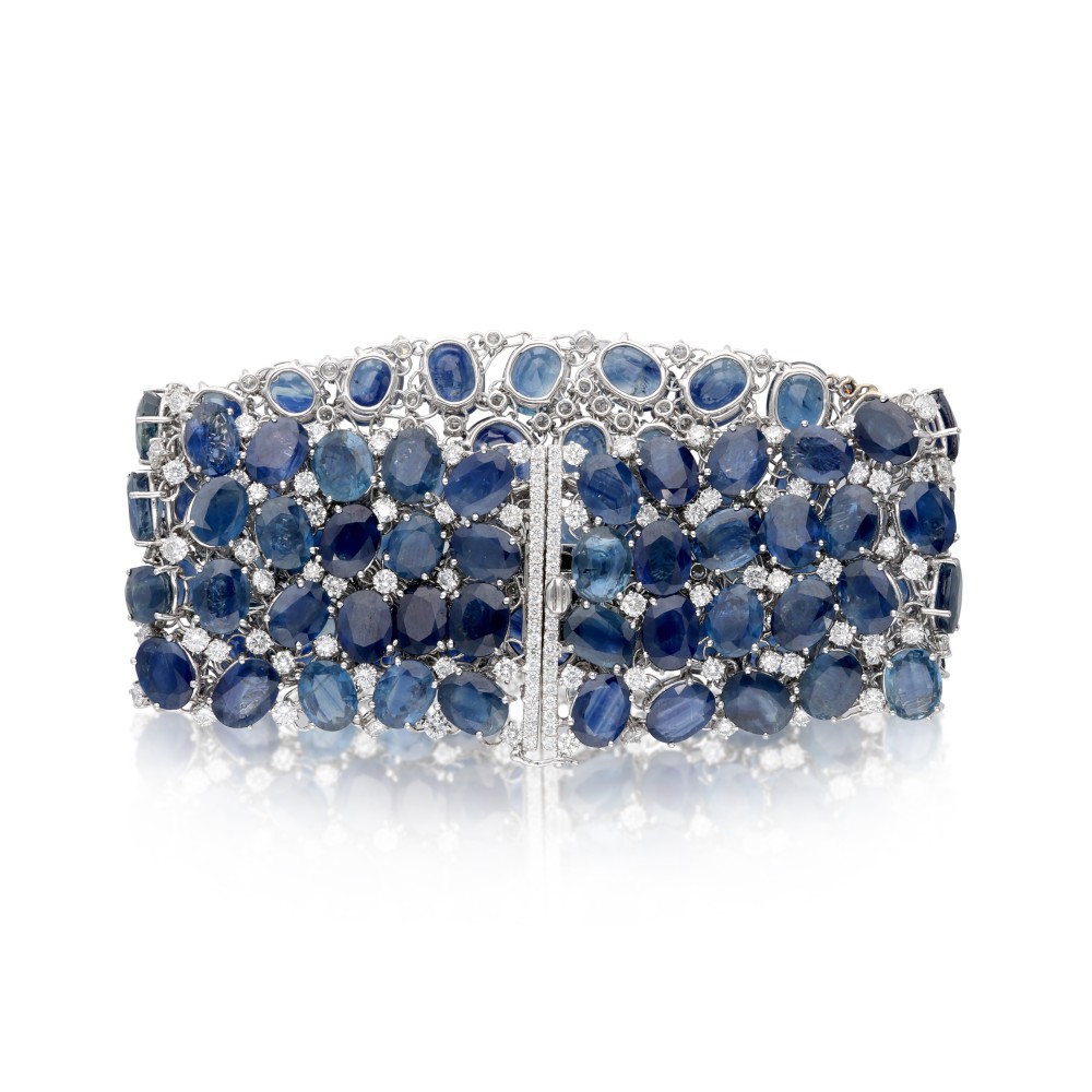Composed of 87 oval sapphires, accented by 215 round brilliant-cut diamonds.