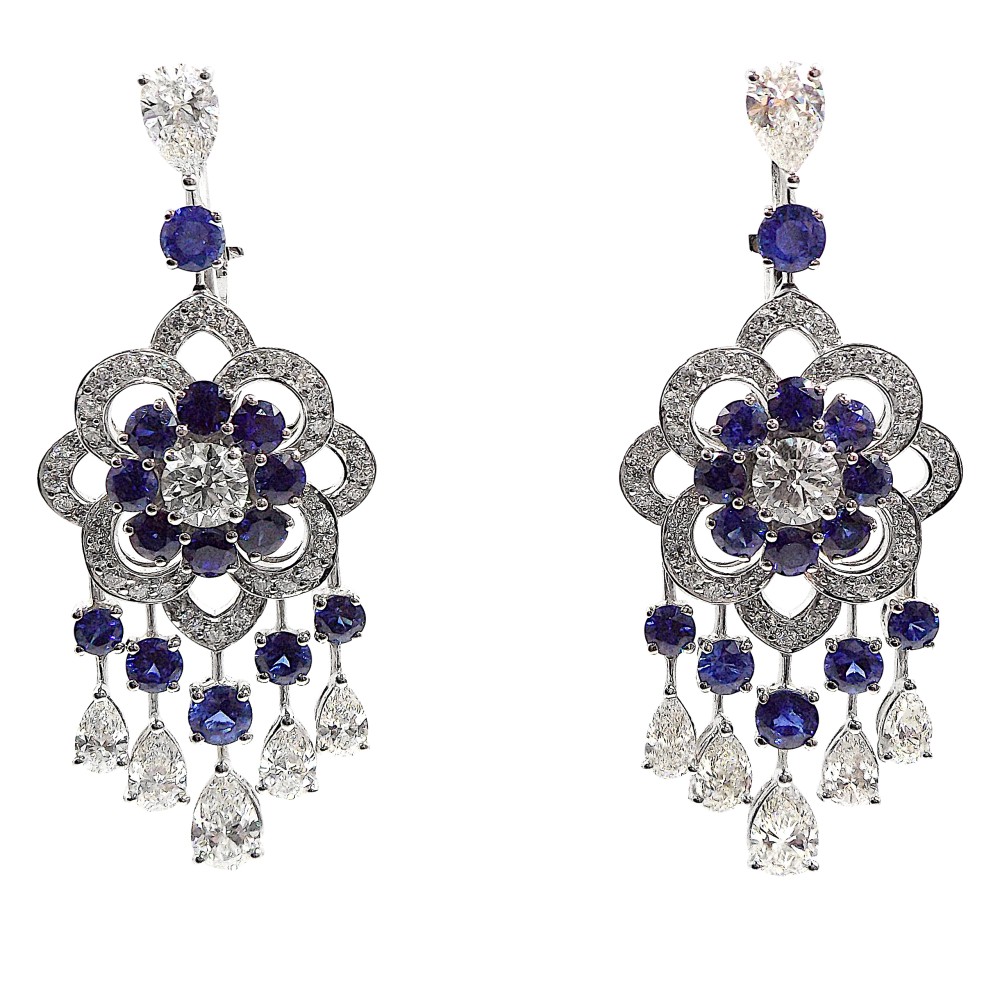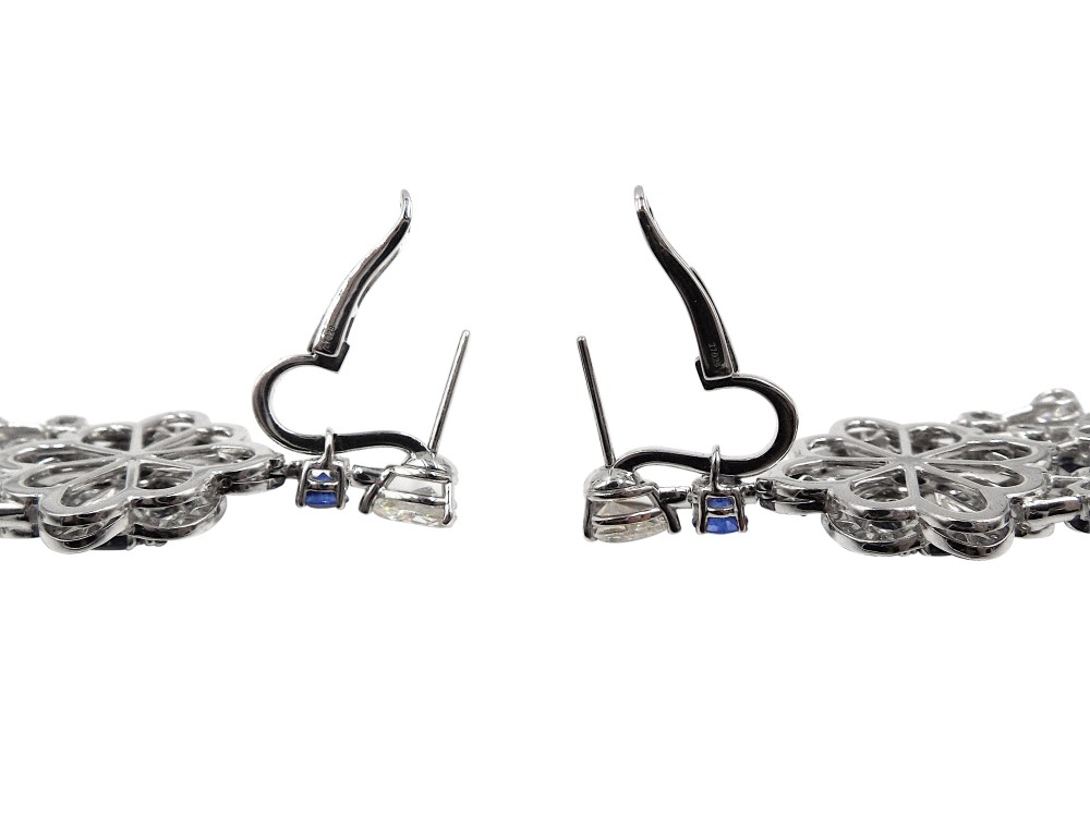 Centering 2 round brilliant-cut diamonds with 28 round sapphires, accented by 12 pear-shaped diamonds and 112 round diamonds.