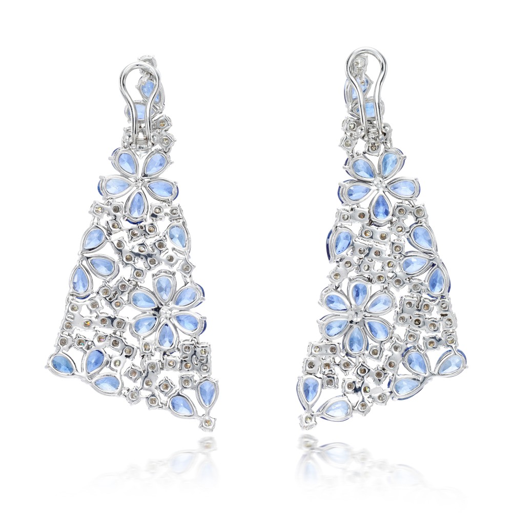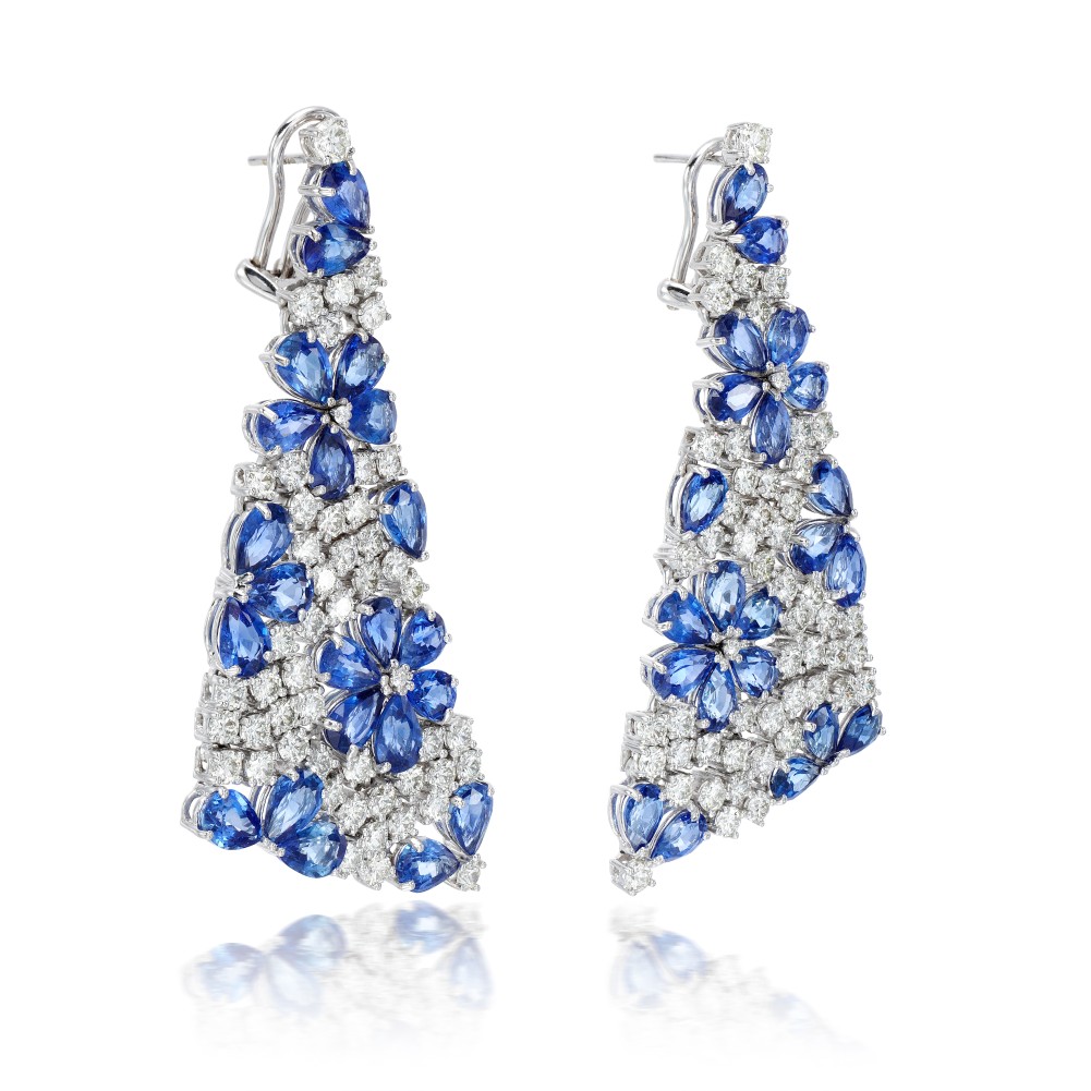 Pear-shaped sapphires and round brilliant diamond claw-set large triangular moveable drop earrings.