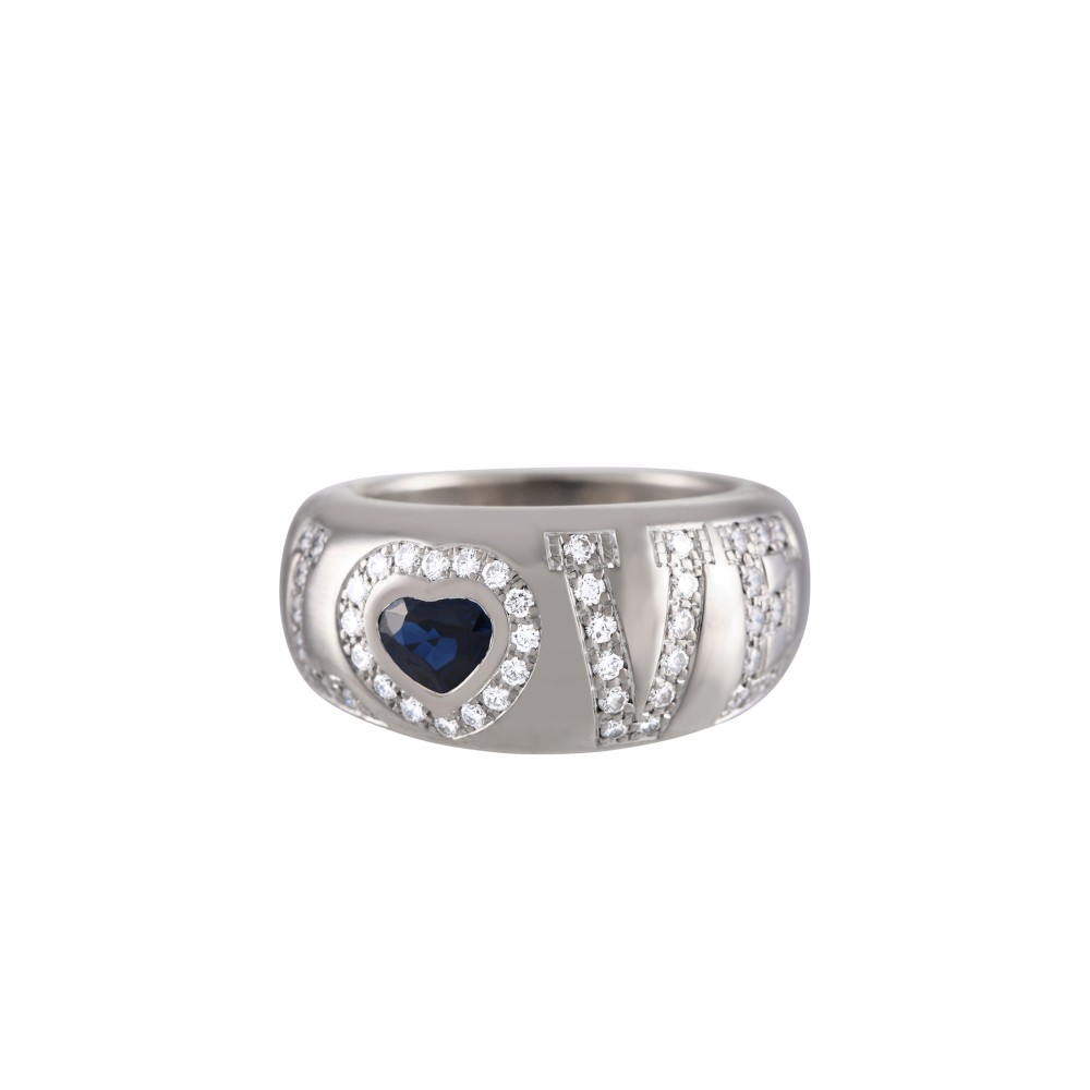 Centering a heart-shaped sapphire, accented by round diamonds.
