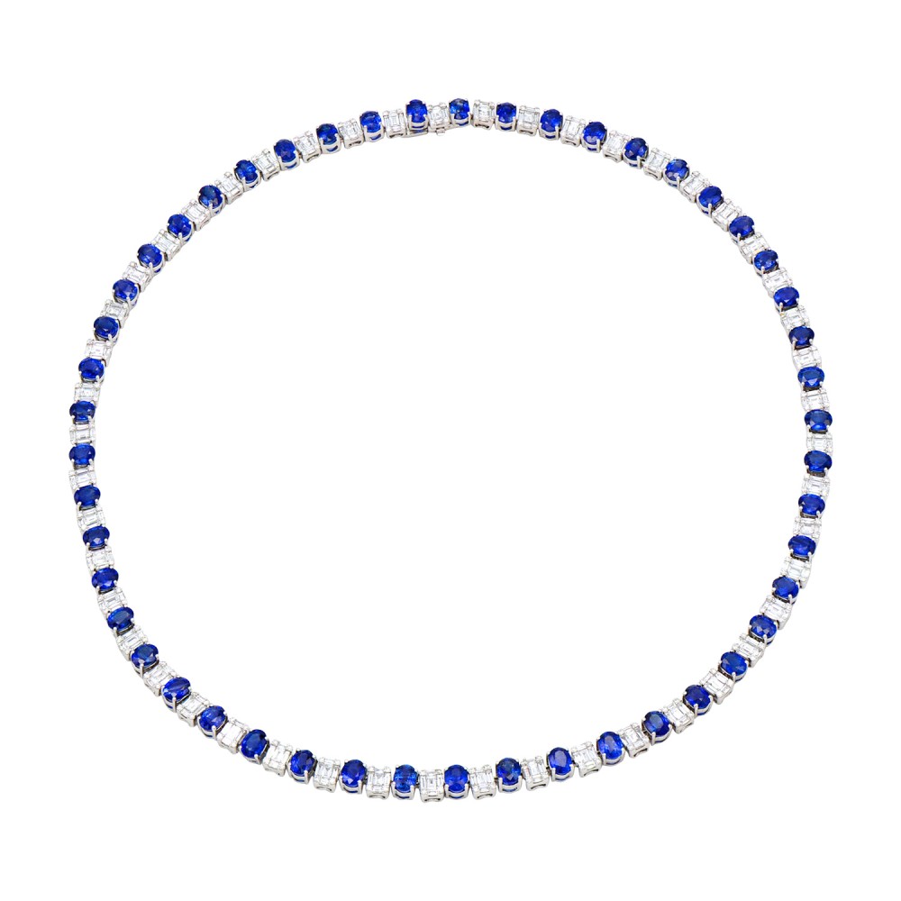 Alternating with 49 oval-shaped sapphires and diamond composites, set with round brilliant cut diamonds and baguette diamonds.