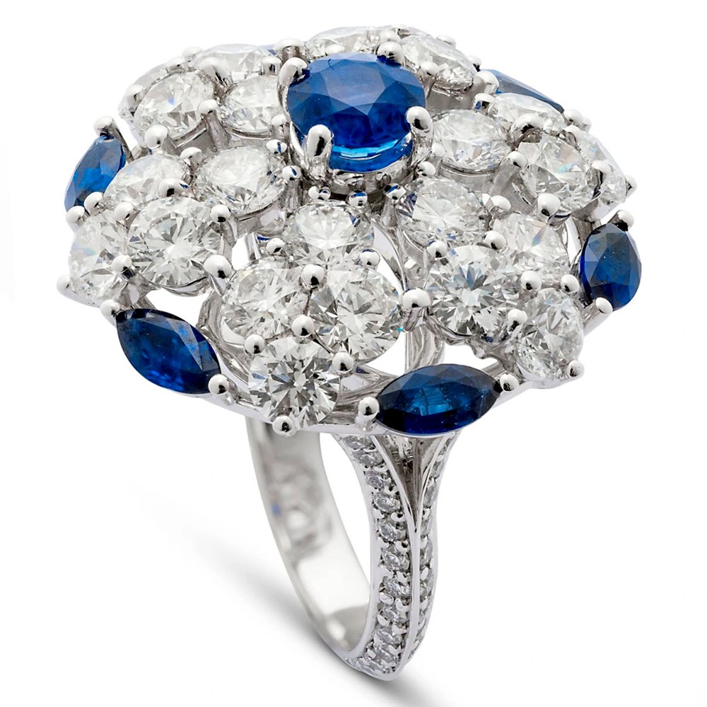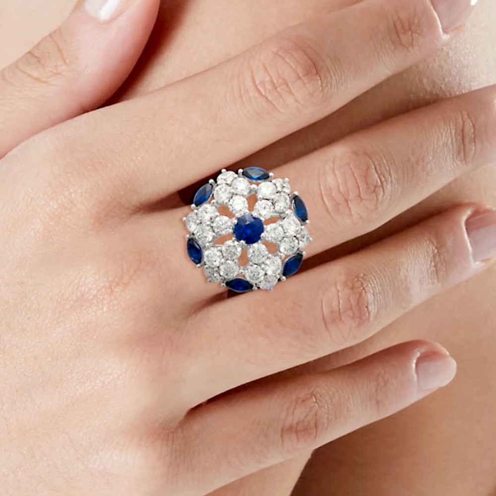 The ring of snowflake design, centering a round sapphire accented by numerous round diamonds and 6 oval-shaped sapphires, the band set with diamonds.