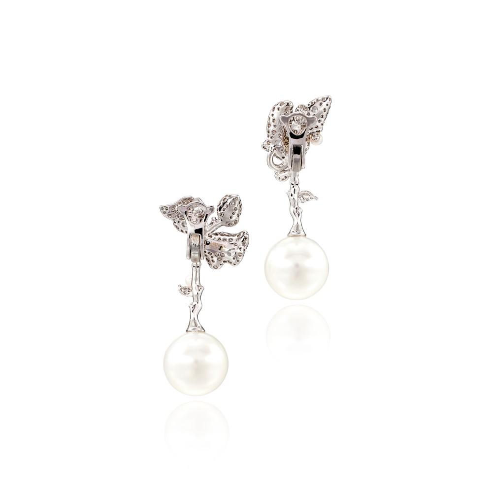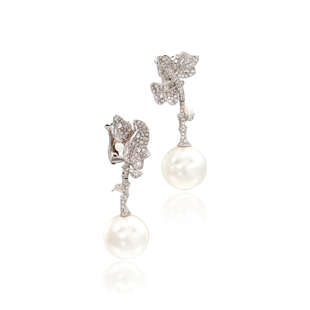 Featuring two South Sea pearls, suspended from leaf motifs, set with round diamonds and rose-cut diamonds.