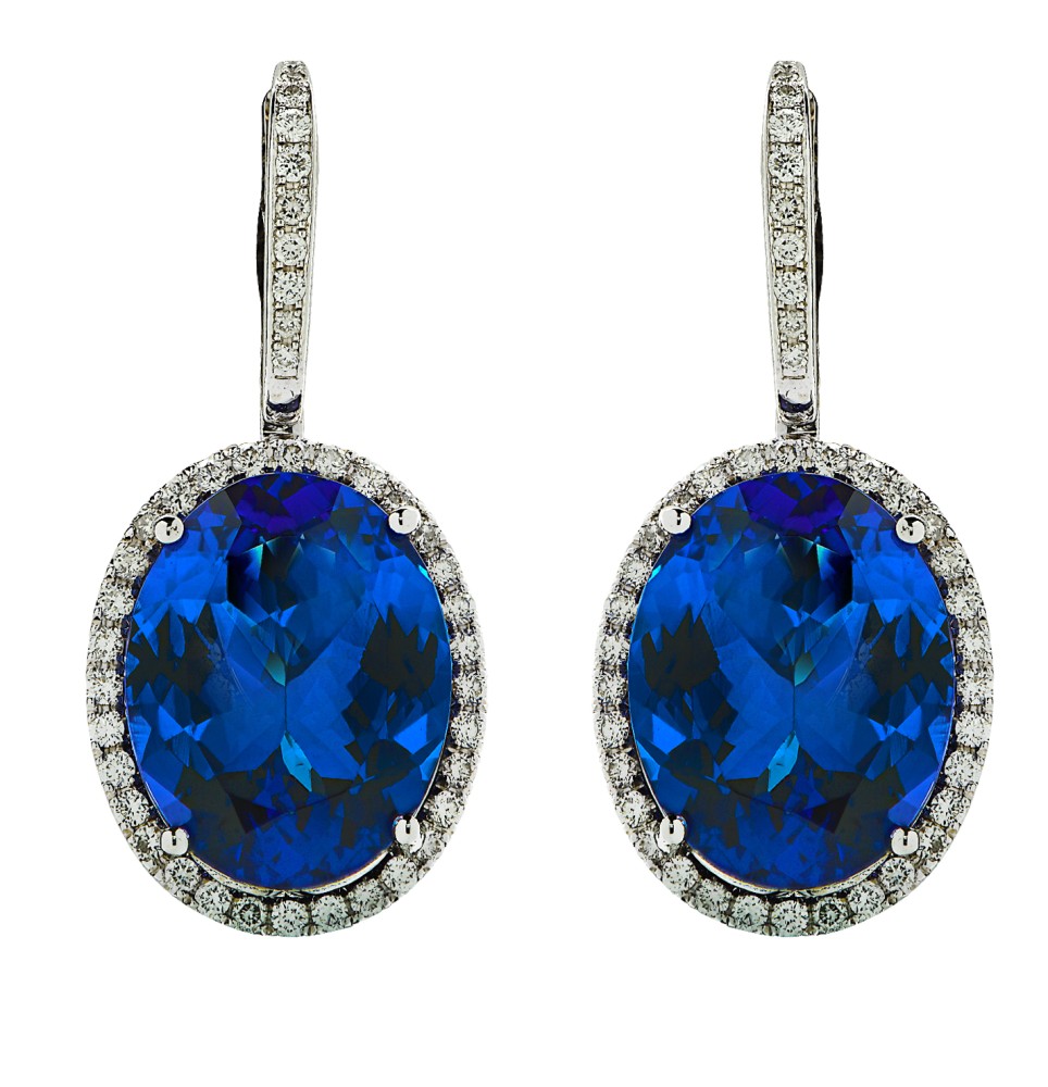Each set with an oval-shaped tanzanite, accented by 84 round brilliant-cut diamonds.