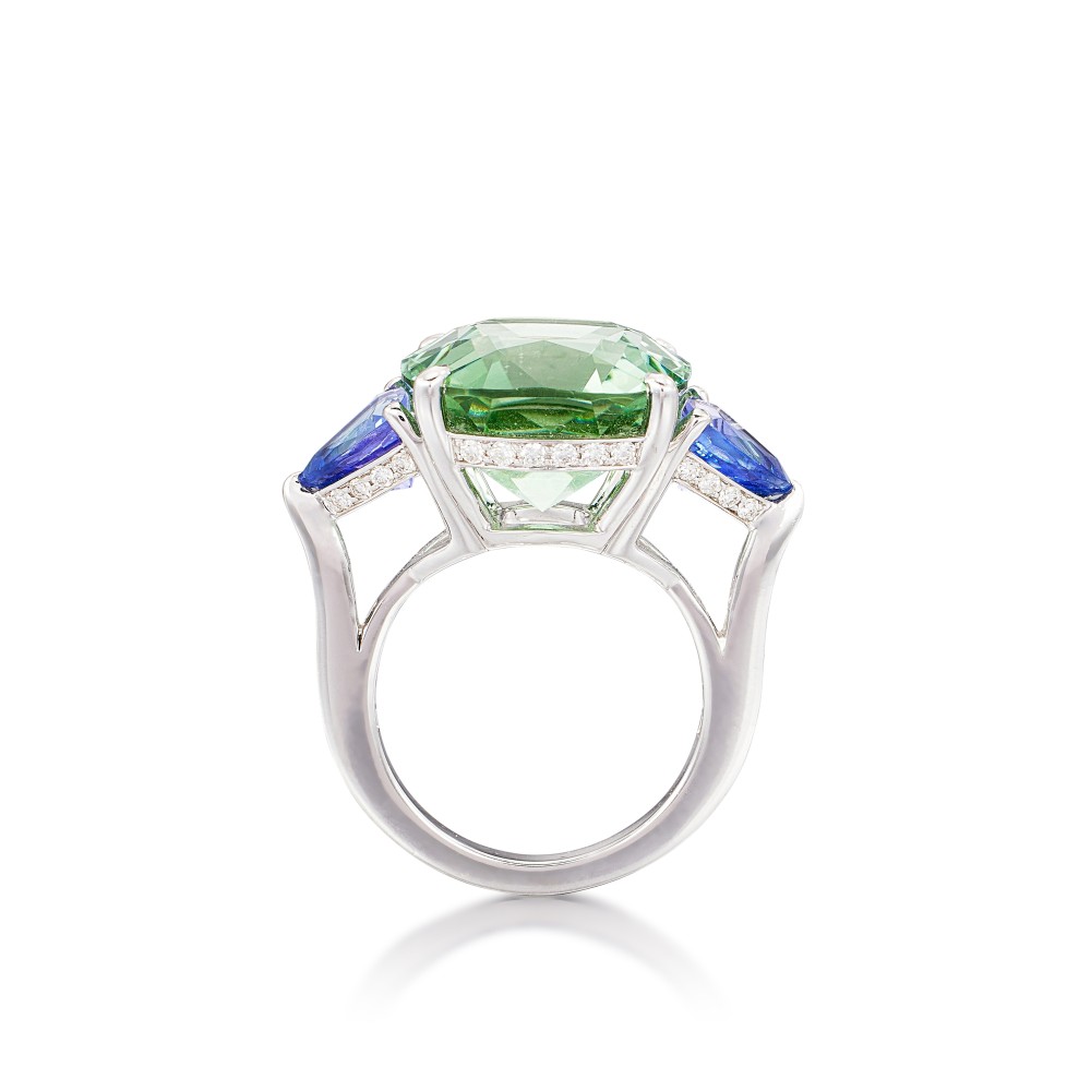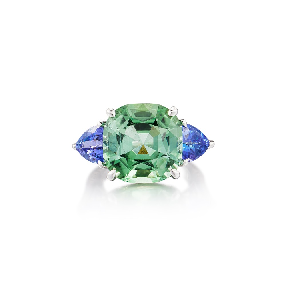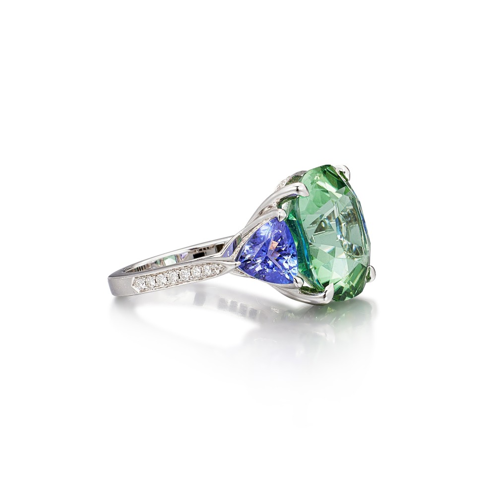 Centering a green tourmaline, set with 2 trillion-cut tanzanites, accented by round diamonds.